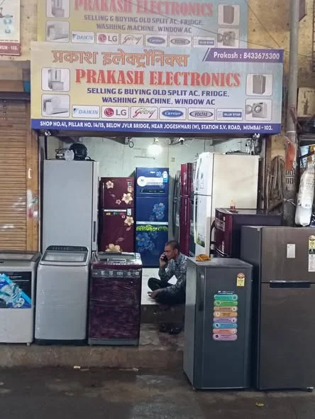 This advertisement is for Prakash electronic and Vijay electronic shops, both open from 11:00 AM to 9:00 PM. The shop offers second-hand washing machines and fridges. It is located...