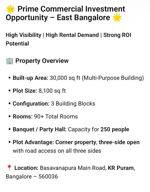 A prime commercial property is available for sale in East Bangalore. The multi-purpose building spans 30,000 sft and is situated on an 8,100 sft corner plot with three-side open ac...