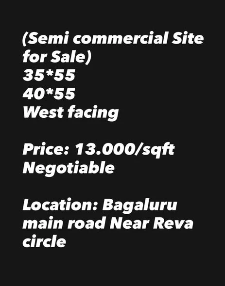 This is a semi-commercial site available for sale. It features BBMP B katha/E katha documentation. There are two size options: 35x55 and 40x55, both facing West. The price is 13000...