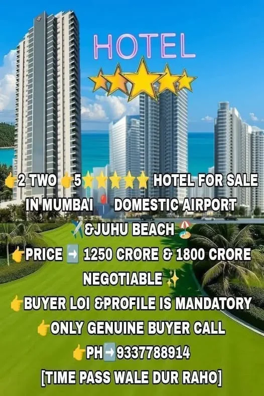 5 hotels are available for sale in Mumbai's Juhu Beach area. The asking price for the hotels is 1800 CR. The listing specifies that only genuine buyers should contact, and time was...