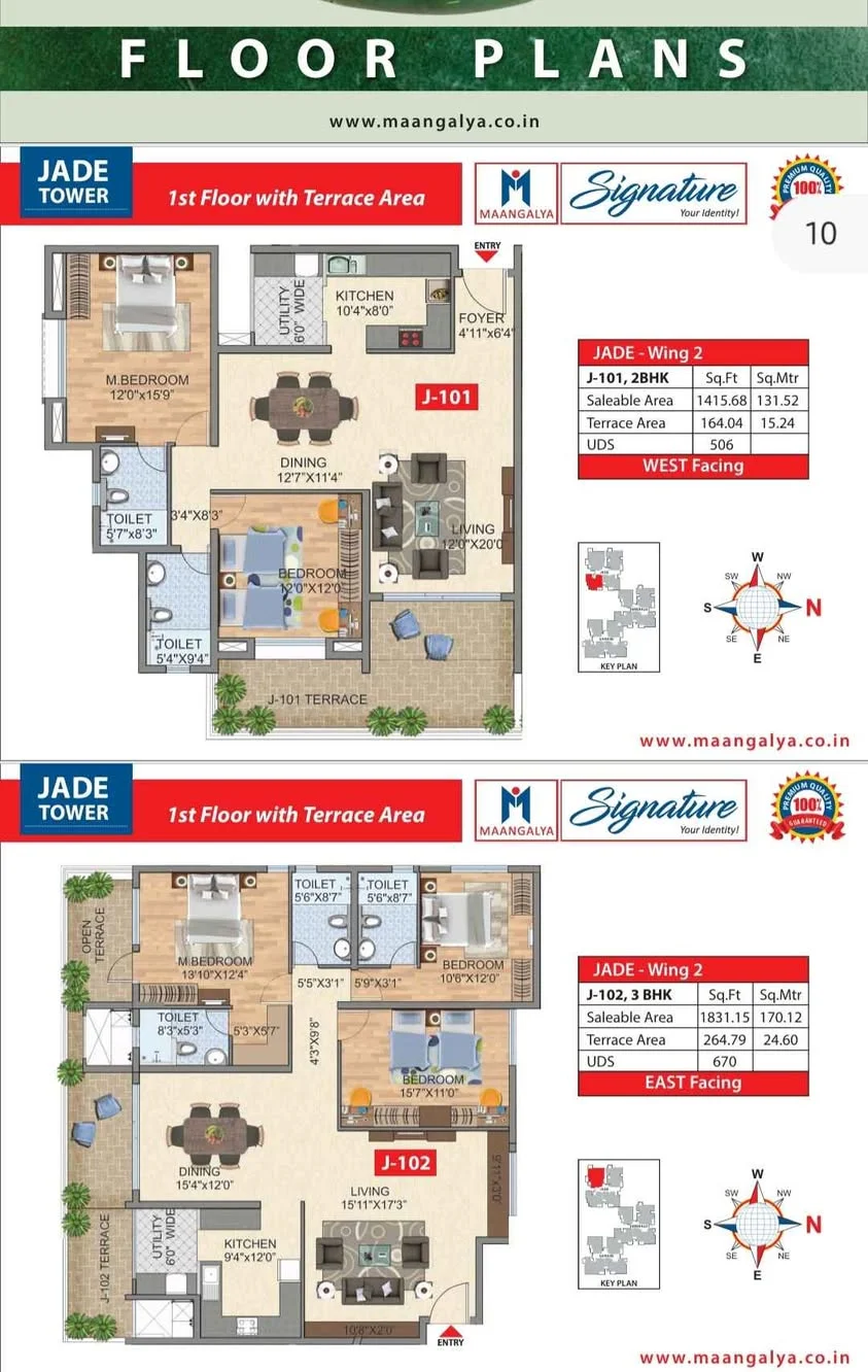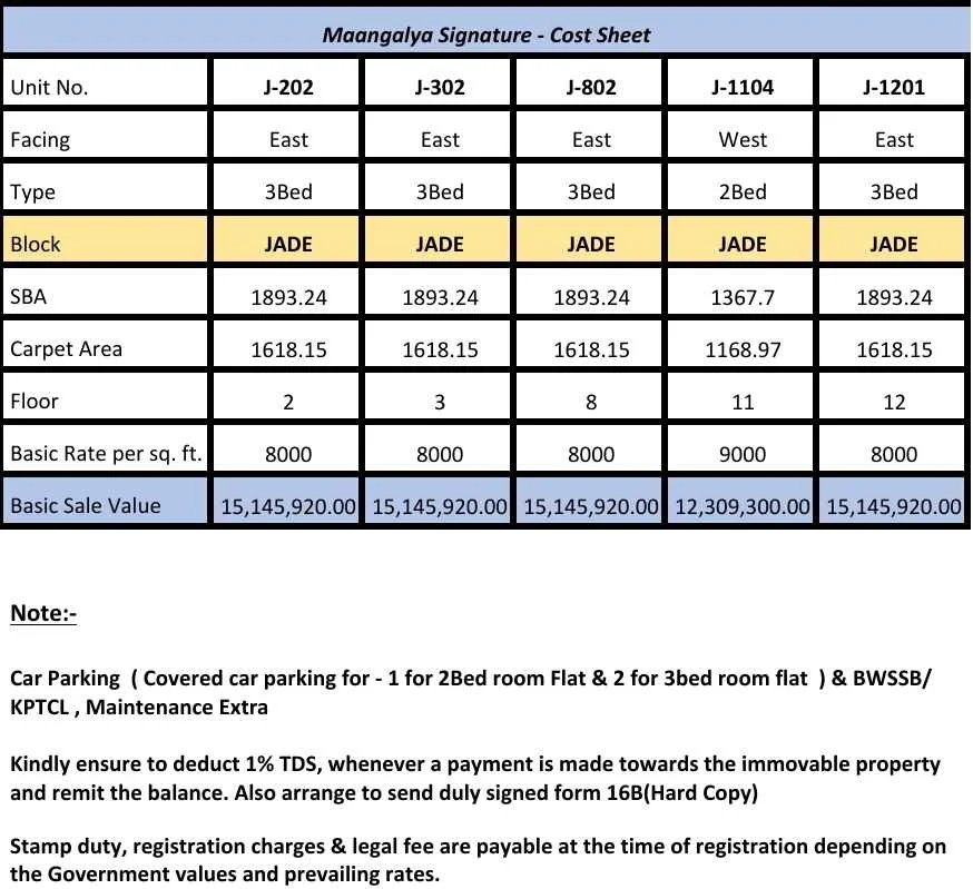 Available flats for sale in JP Nagar 9th Phase, Project: Maangalya Signature Anjanapura near Konankunte. Options include a 2 BHK with a size of 1368 sft (Carpet area: 1169 sft, 1 c...