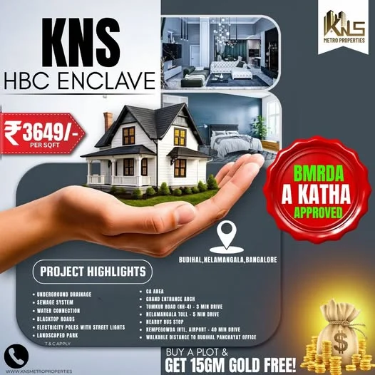 Plots are available for sale near Nelamangala. The plots are E-Khata and DC converted, with prices starting from ₹3,649 per sqft. The location is in Bengaluru, Karnataka.