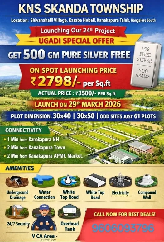 Limited plots are available for sale in Kanakapura, Shivanahalli, Bengaluru. The project is KNS Skanda Township.
