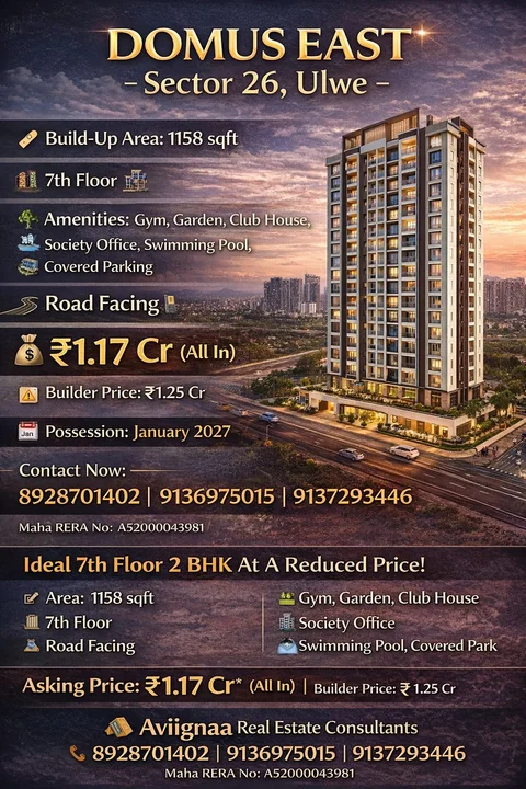 This is a 2 BHK flat for sale in Domus East, Sector 26, Ulwe. The home is spacious and well-planned, with a build-up area of 1158 sq.ft. It is located on the 7th floor and is road ...