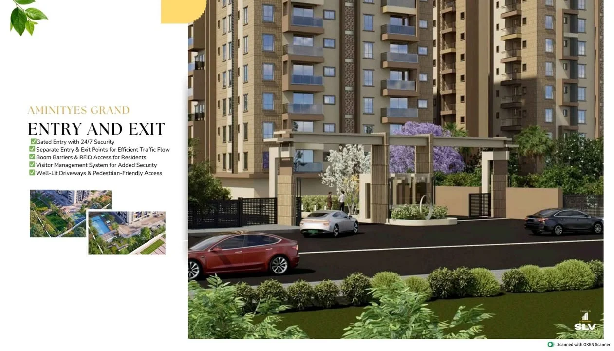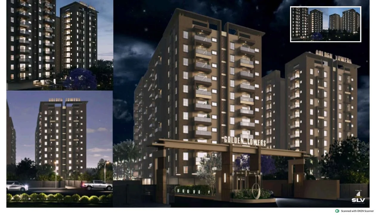 This real estate listing advertises flats in SLV Golden Tower located near Kogilu cross down bazaar road, opposite an upcoming metro station in Bengaluru. The project spans 3.5 acr...