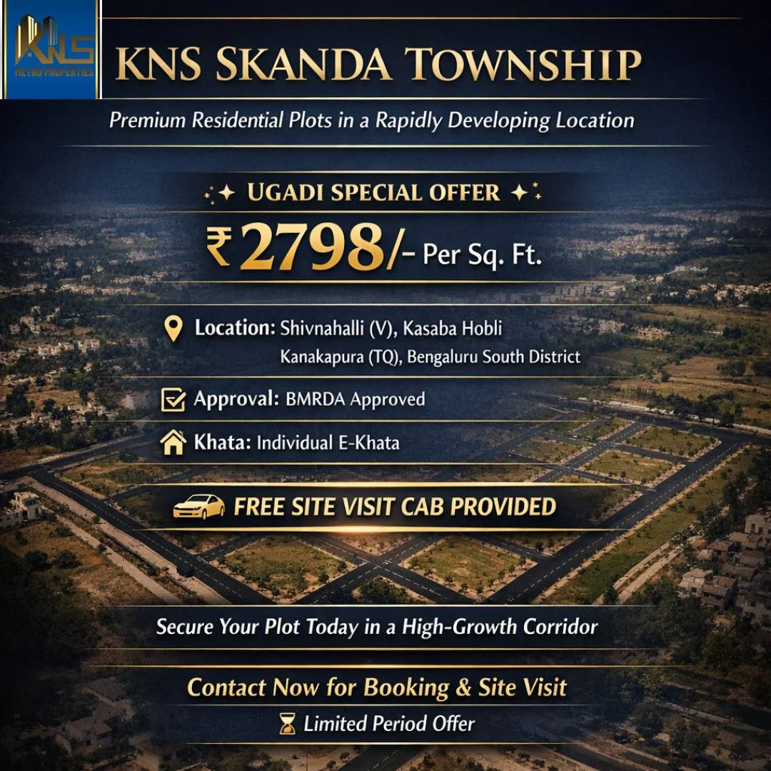KNS Skanda Township offers BMRDA individual E-Khata plots in Shivanahalli, Kanakapura, Bangalore South, with an ultimate launching offer price of Rs.2798 per sq.ft. Plot dimensions...