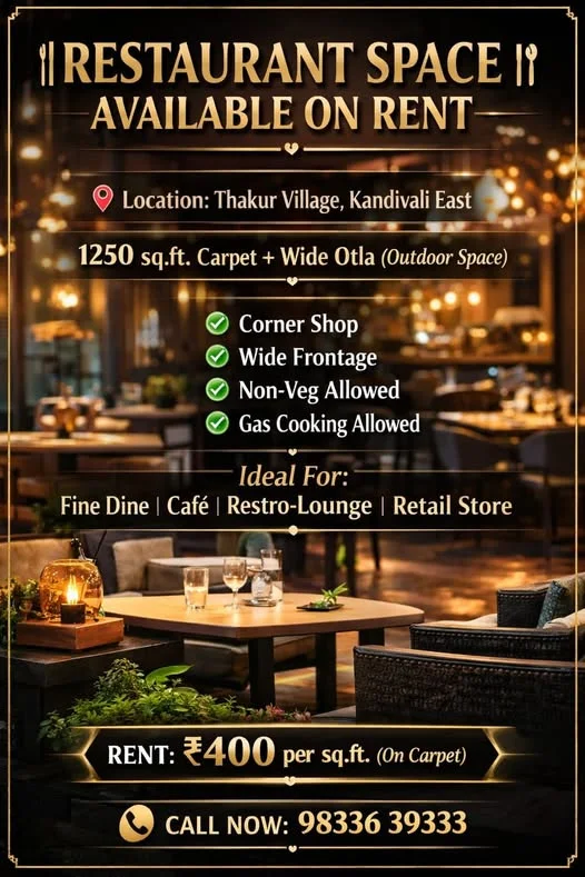 An exclusive F&B space is available for rent in Thakur Village, Kandivali East, Mumbai. The premium space features a 1250 sq.ft. carpet area, a huge frontage with 4 shutters, and a...