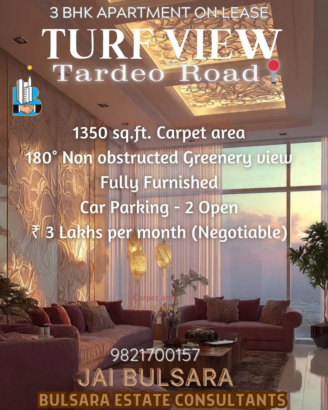 A new residential 3 BHK flat is available for lease in Turf View, Tardeo Road. The carpet area is 1350 sq.ft. It offers a 180-degree unobstructed greenery view and is fully furnish...