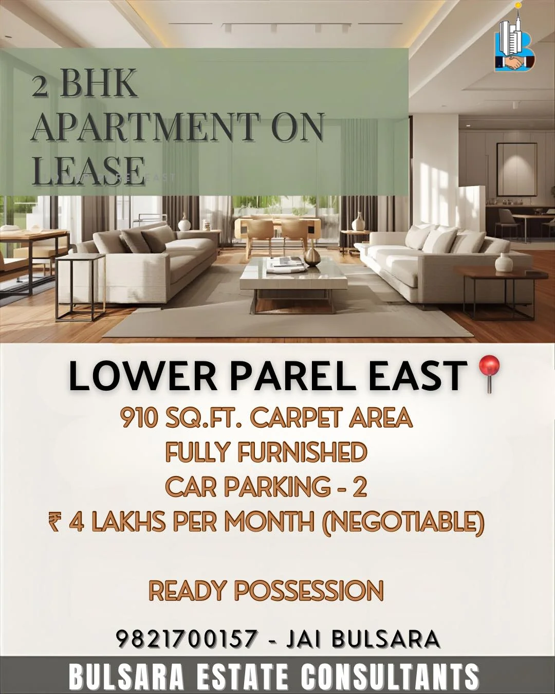 A new residential space is available for lease in Lower Parel East. The property is a fully furnished 2 BHK with a carpet area of 910 sq.ft. It includes 2 car parking spaces. The m...
