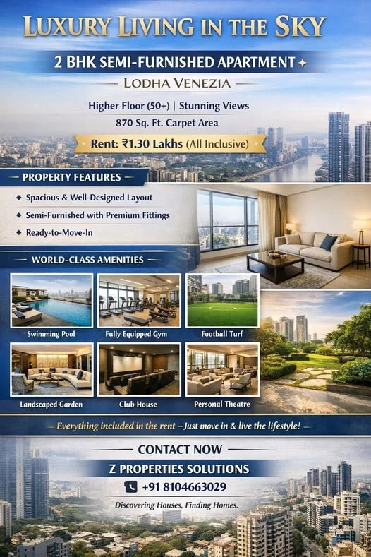 This is a premium 2 BHK apartment for rent in Lodha, Parel. The apartment is located on the 59th floor and offers a spacious 850 sq.ft. carpet area with modern design. It features ...
