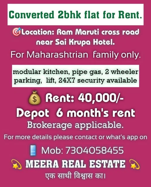 A completely renovated, unused 2BHK flat is available for rent, specifically for a Maharashtrian family. It is located near Ram Maruti cross road, close to Sai Krupa Hotel. The fla...