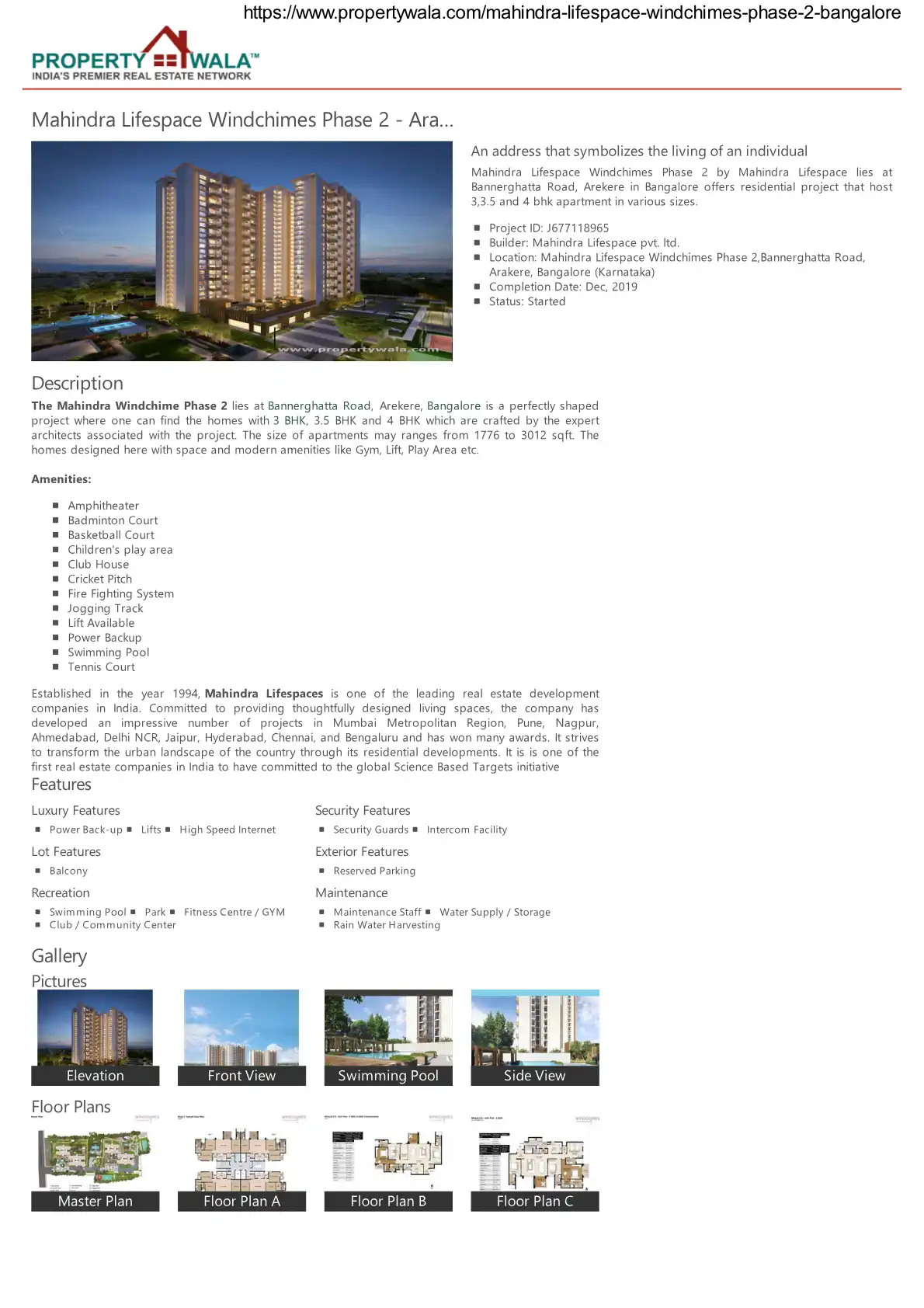 Mahindra Lifespace Windchimes Phase 2 lies at Bannerghatta Road, Arekere, Bangalore is a perfectly shaped project where one can find the homes with 3 BHK, 3.5 BHK and 4 BHK which are crafted by the expert architects associated with the project. The s...