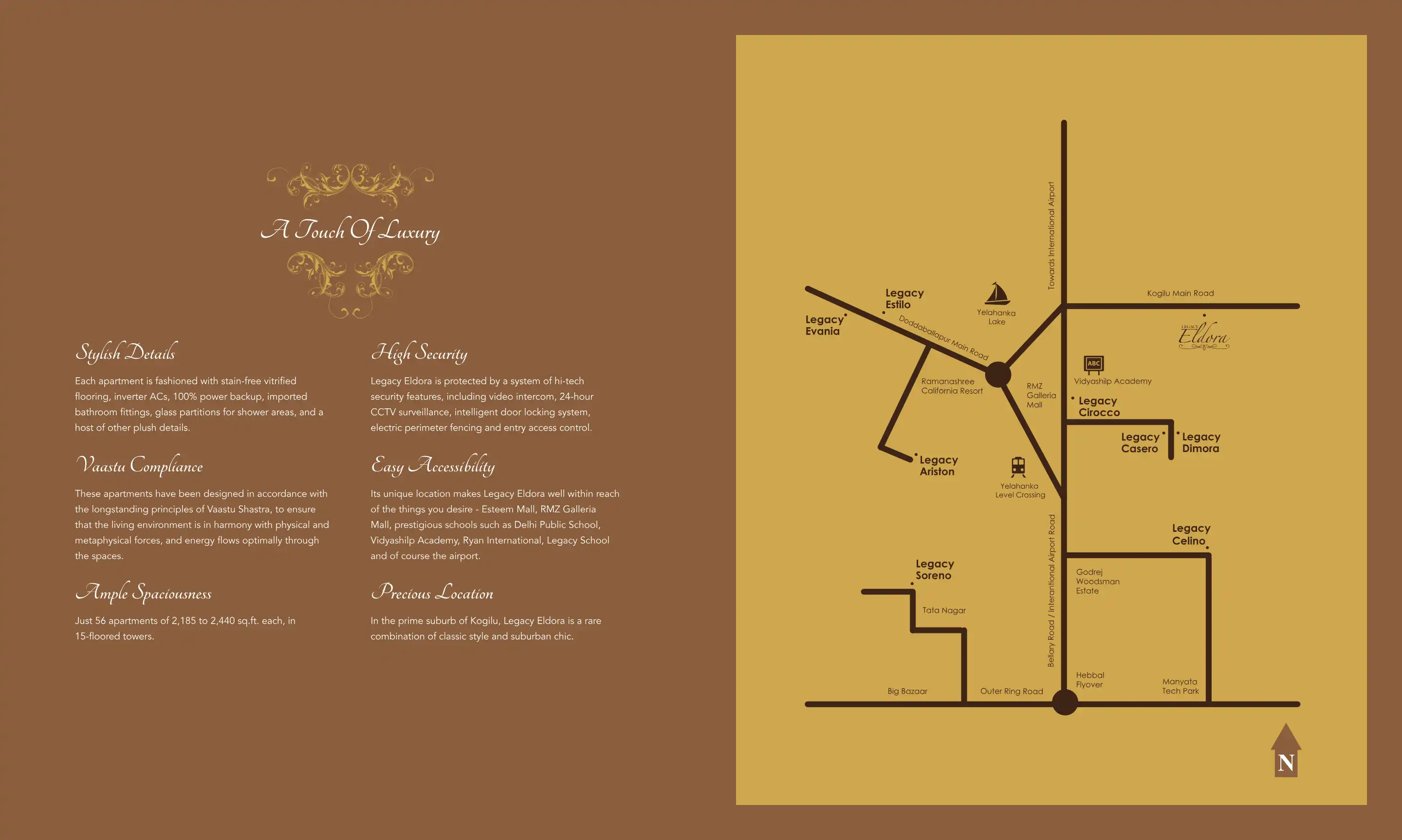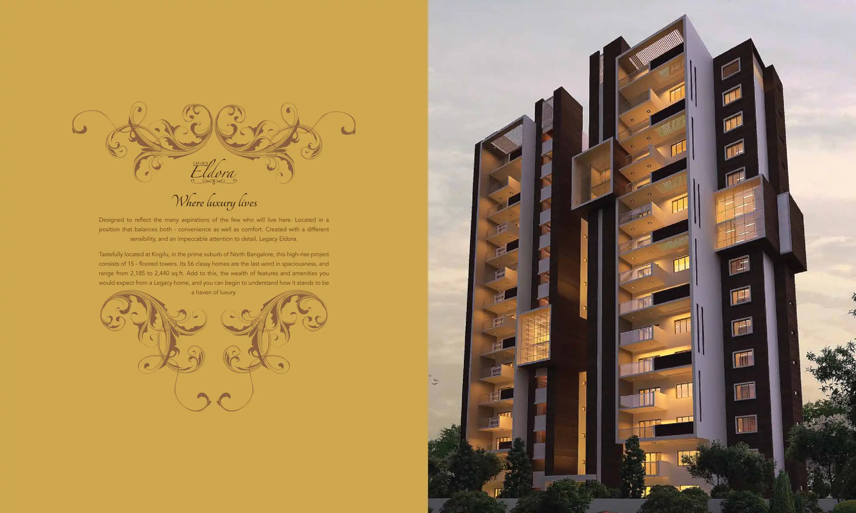 Tastefully located at Kogilu, in the prime suburb of North Bangalore, this high-rise project consists of 15 - floored towers. Its 56 classy homes are the last word in spaciousness, and range from 2,185 to 2,440 sq.ft.