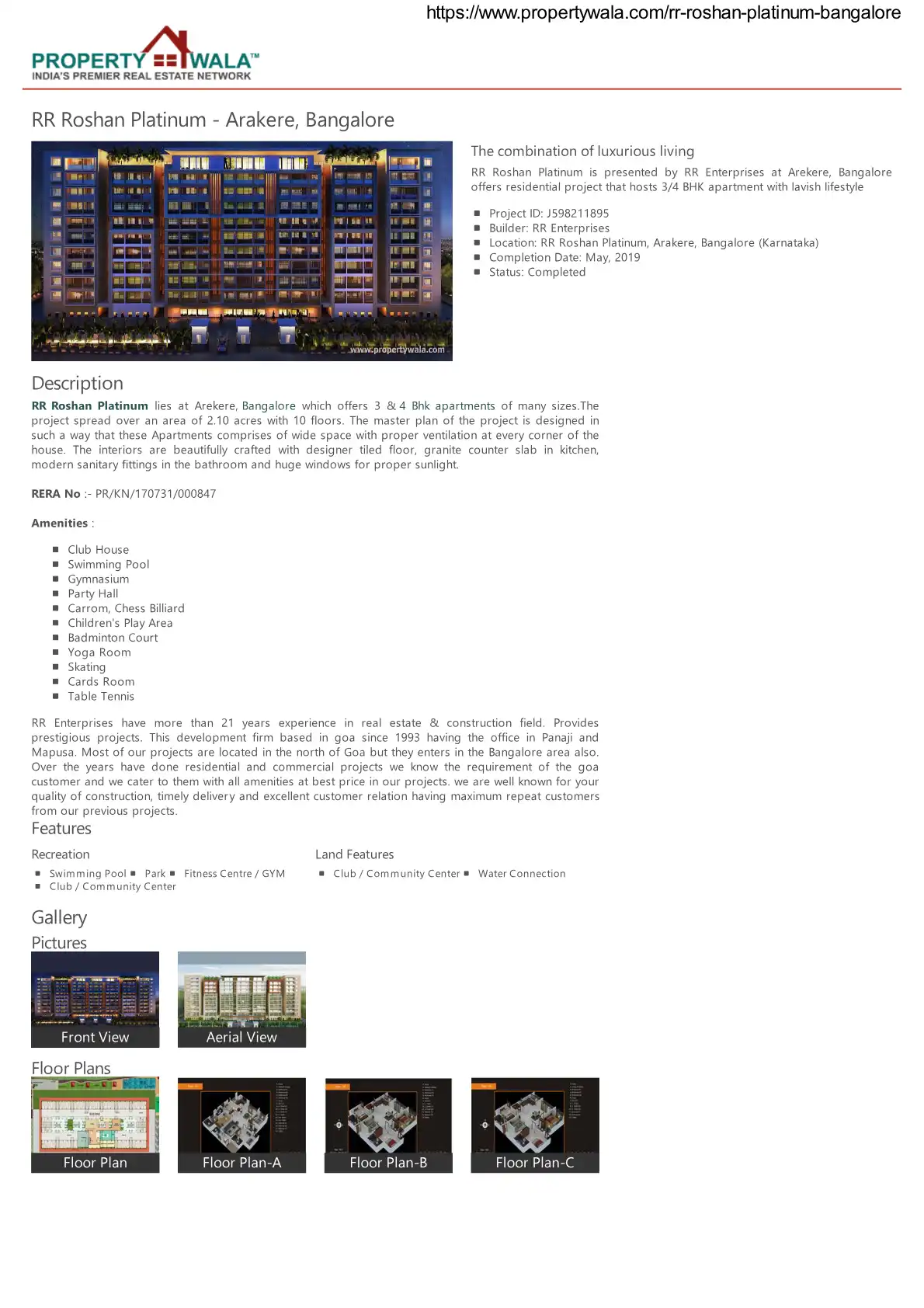 RR Roshan Platinum lies at Arekere, Bangalore which offers 3 & 4 Bhk apartments of many sizes. The project spread over an area of 2.10 acres with 10 floors. The master plan of the project is designed in such a way that these Apartments comprises of w...