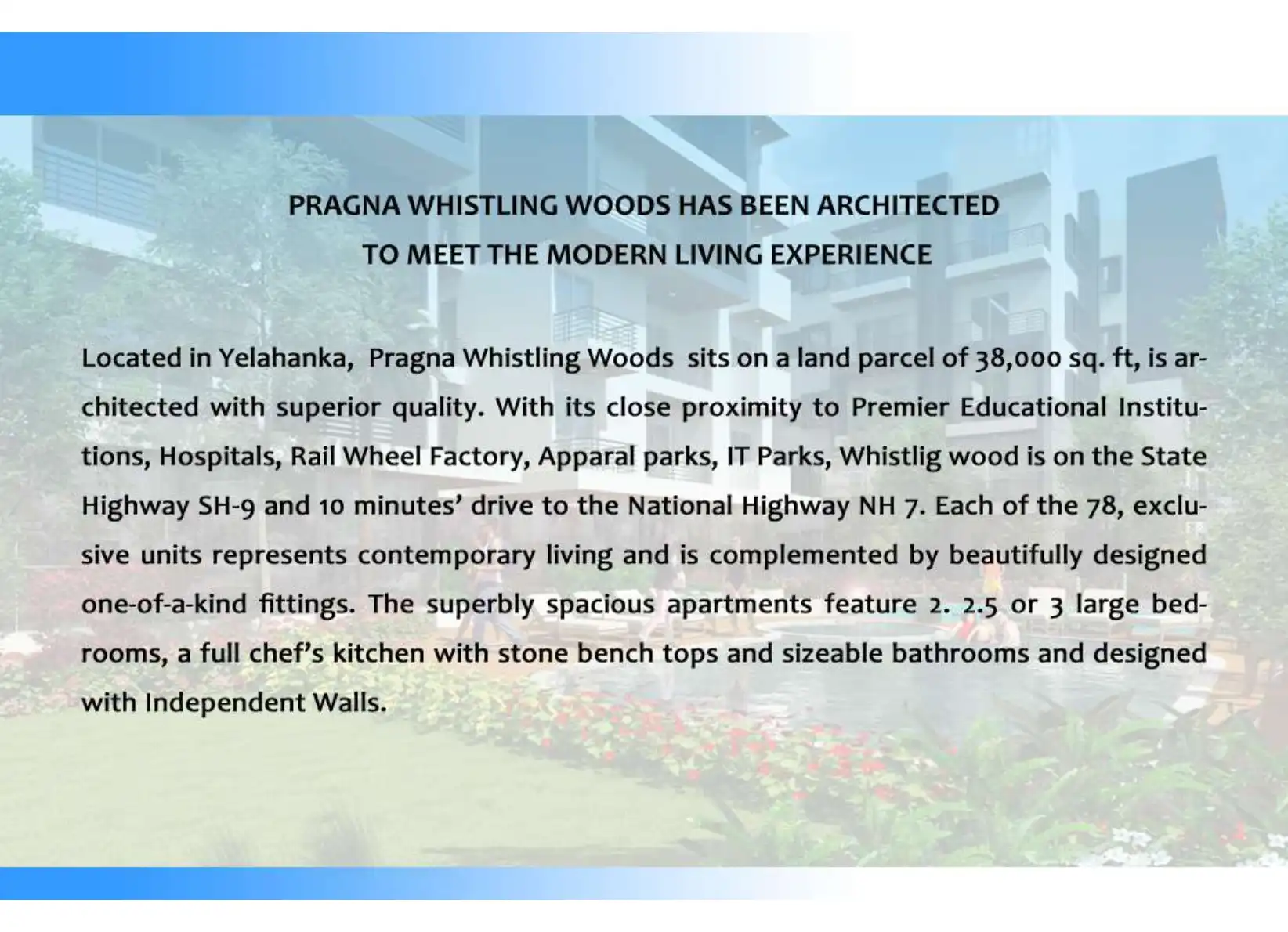 Pragna Whistling Woods sits on a land parcel of 38,000 sq. ft, is architected with superior quality. Each of the 78, exclusive units represents contemporary living and is complemented by beautifully designed one-of-a-kind fittings.