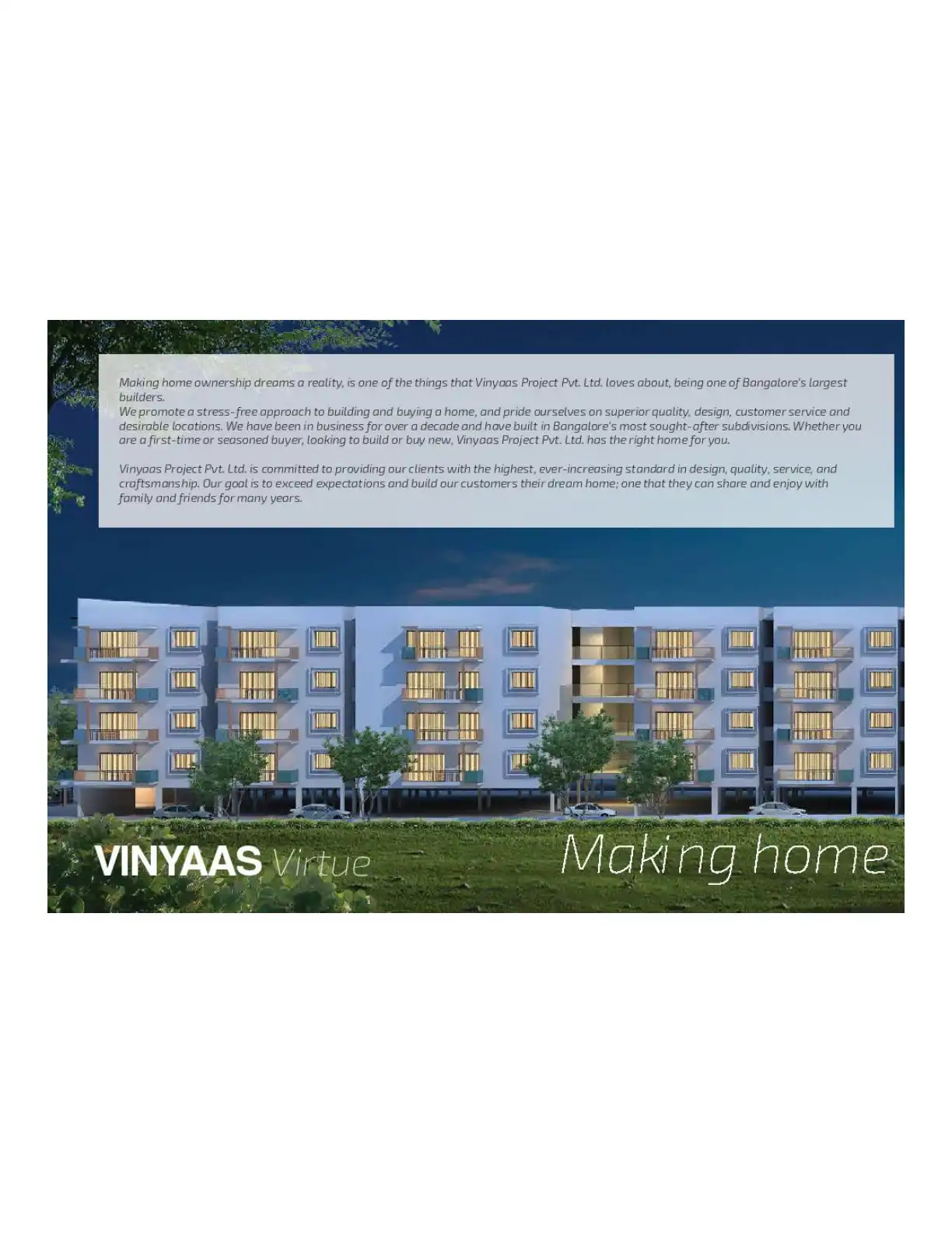 VINYAAS Virtue we've carefully designed the BBMP approved apartments built with best in class building materials to give you the best of luxury while keeping your need for privacy in mind.