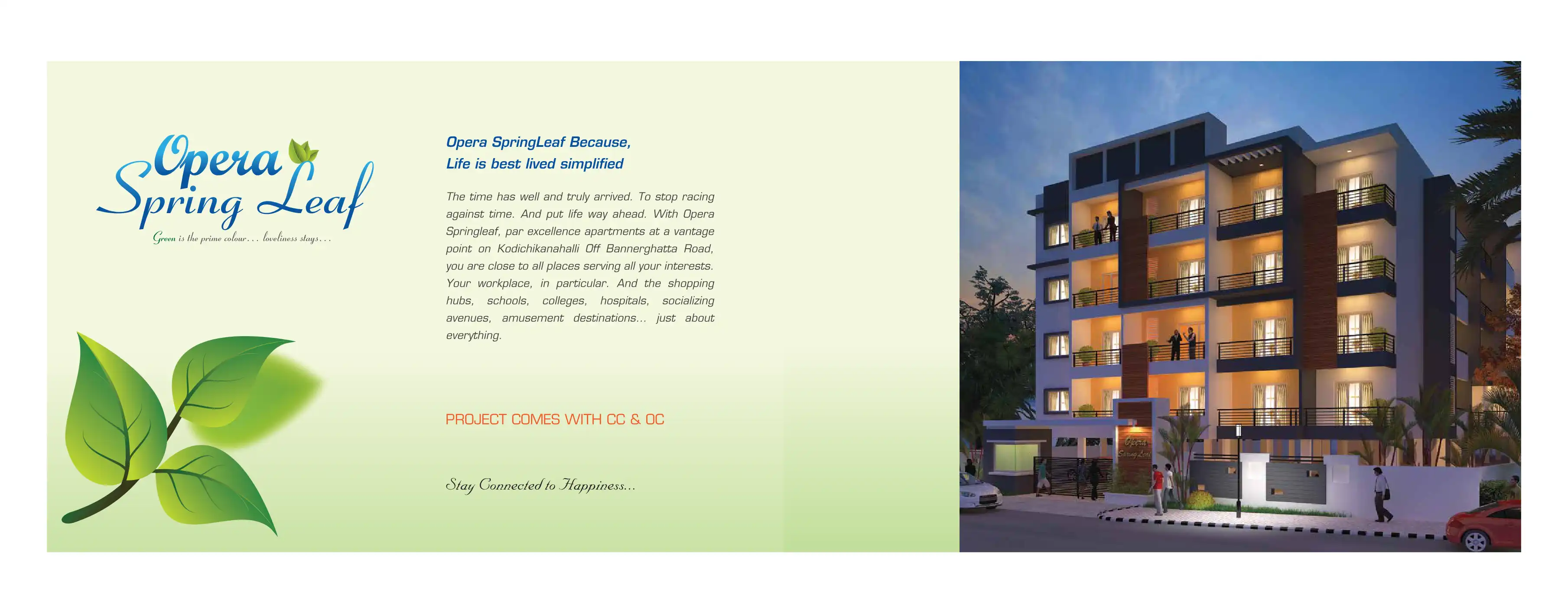 Opera SpringLeaf, par excellence apartments at a vantage point on Kodichikanahalli Off Bannerghatta Road, you are close to all places serving all your interests. Your workplace, in particular. And the shopping hubs, schools, colleges, hospitals, soci...