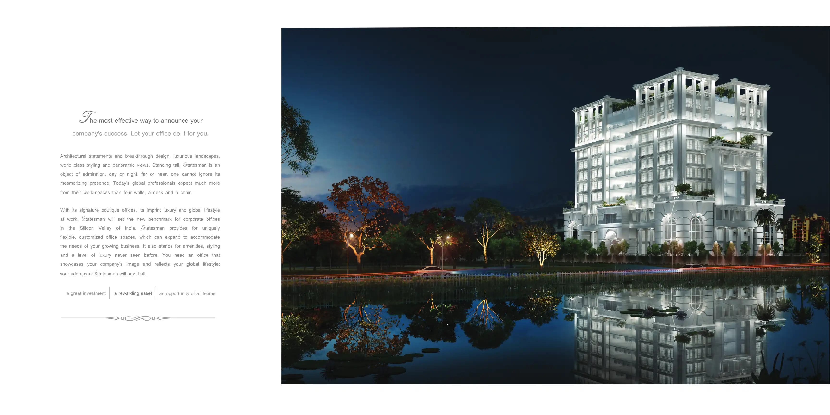 Statesman, truly a world-class development, bringing together the grandeur and majesty of the old-world with a contemporary new-world feel. Lavishly conceived, with luxury reflected in every facet of its iconic design, so as to create in its true sen...