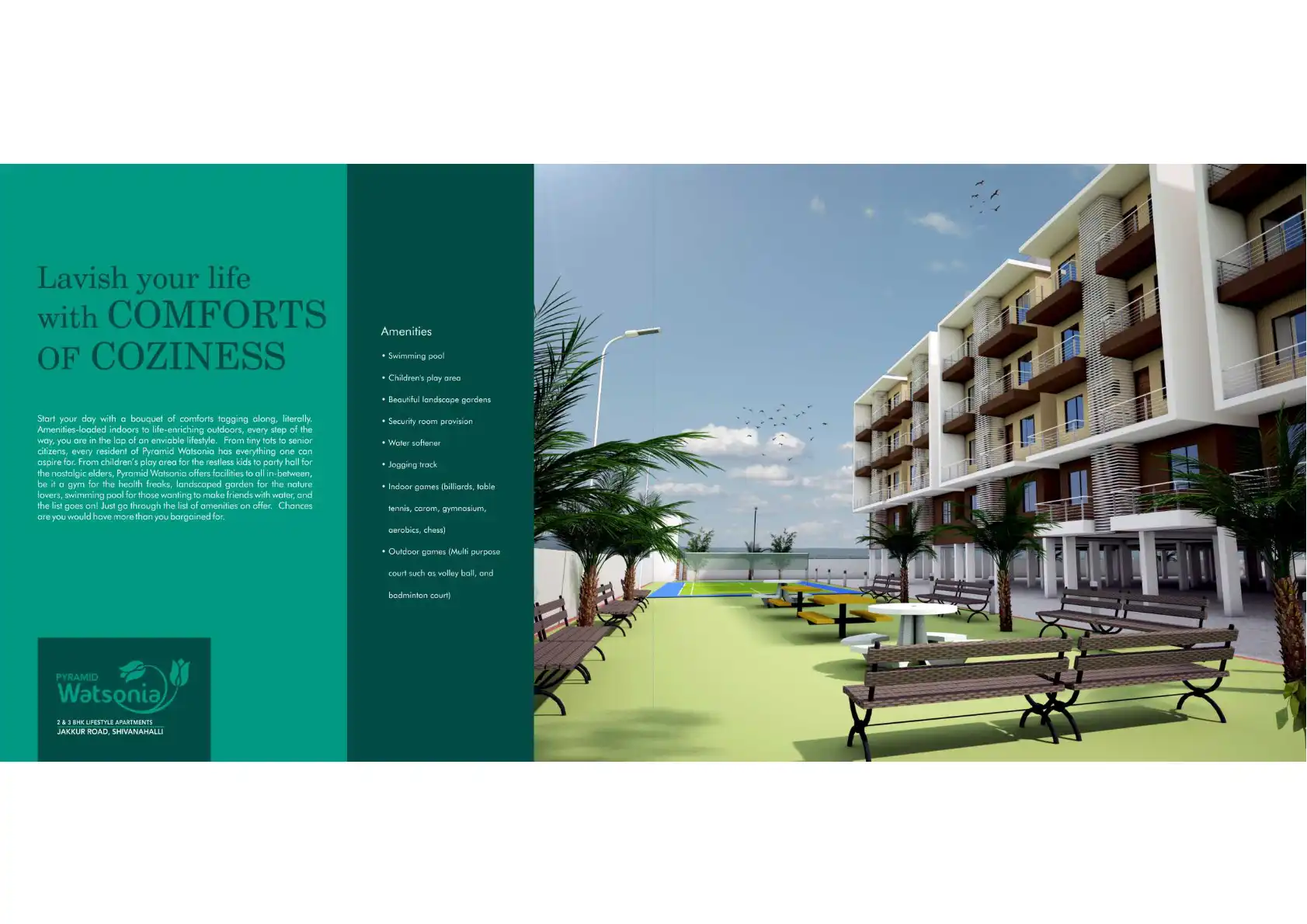 172 units of 2 & 3 BHK lifestyle apartments built into stilt, ground plus three floors of an edifice towering majestically at Shivanhalli on the Jakkur Road, off the New Airport Road.