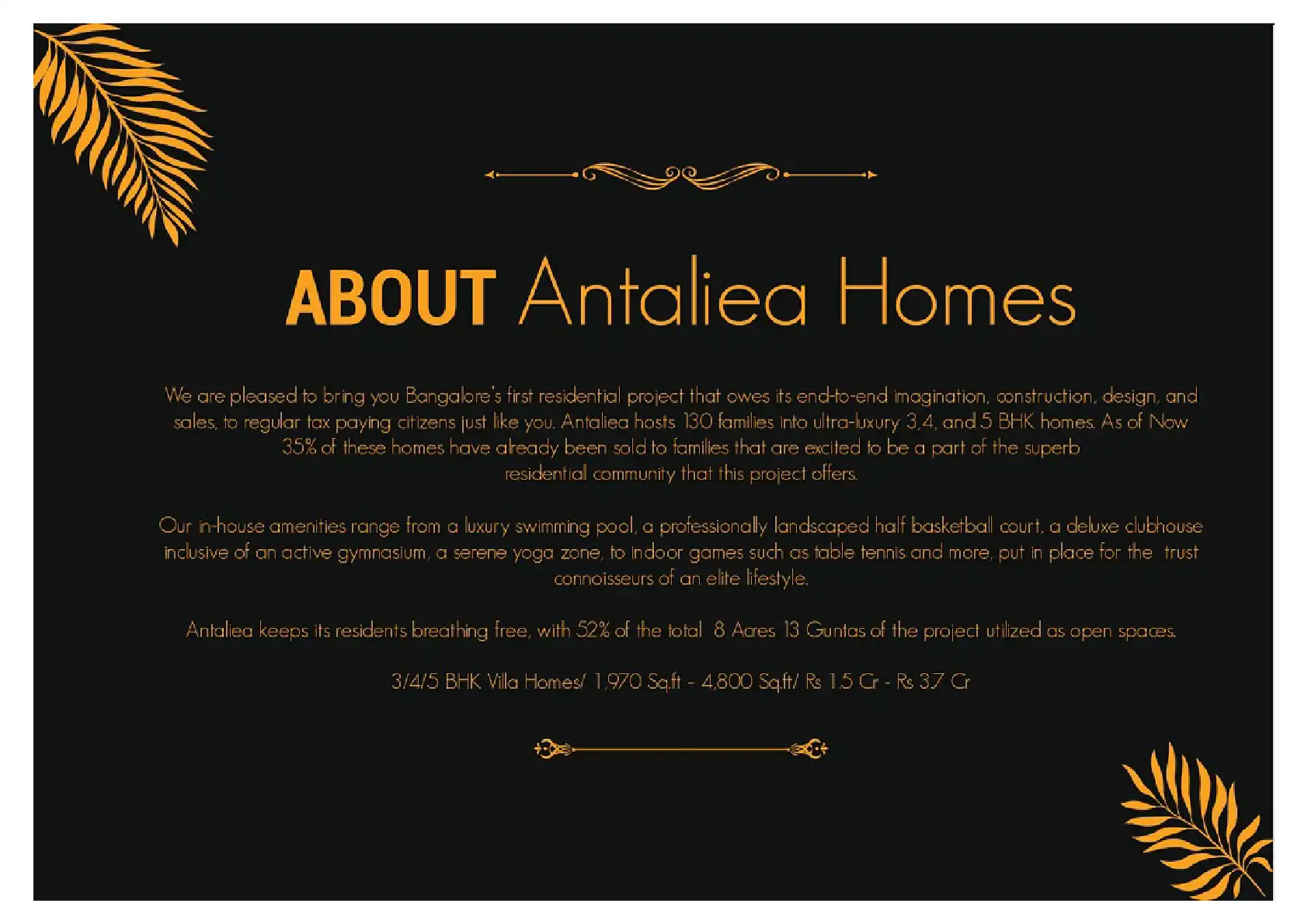 Antaliea hosts 130 families into ultra-luxury 3,4, and 5 BHK homes. Antaliea keeps its residents breathing free, with 52% of the total 8 Acres 13 Guntas of the project utilized as open spaces.