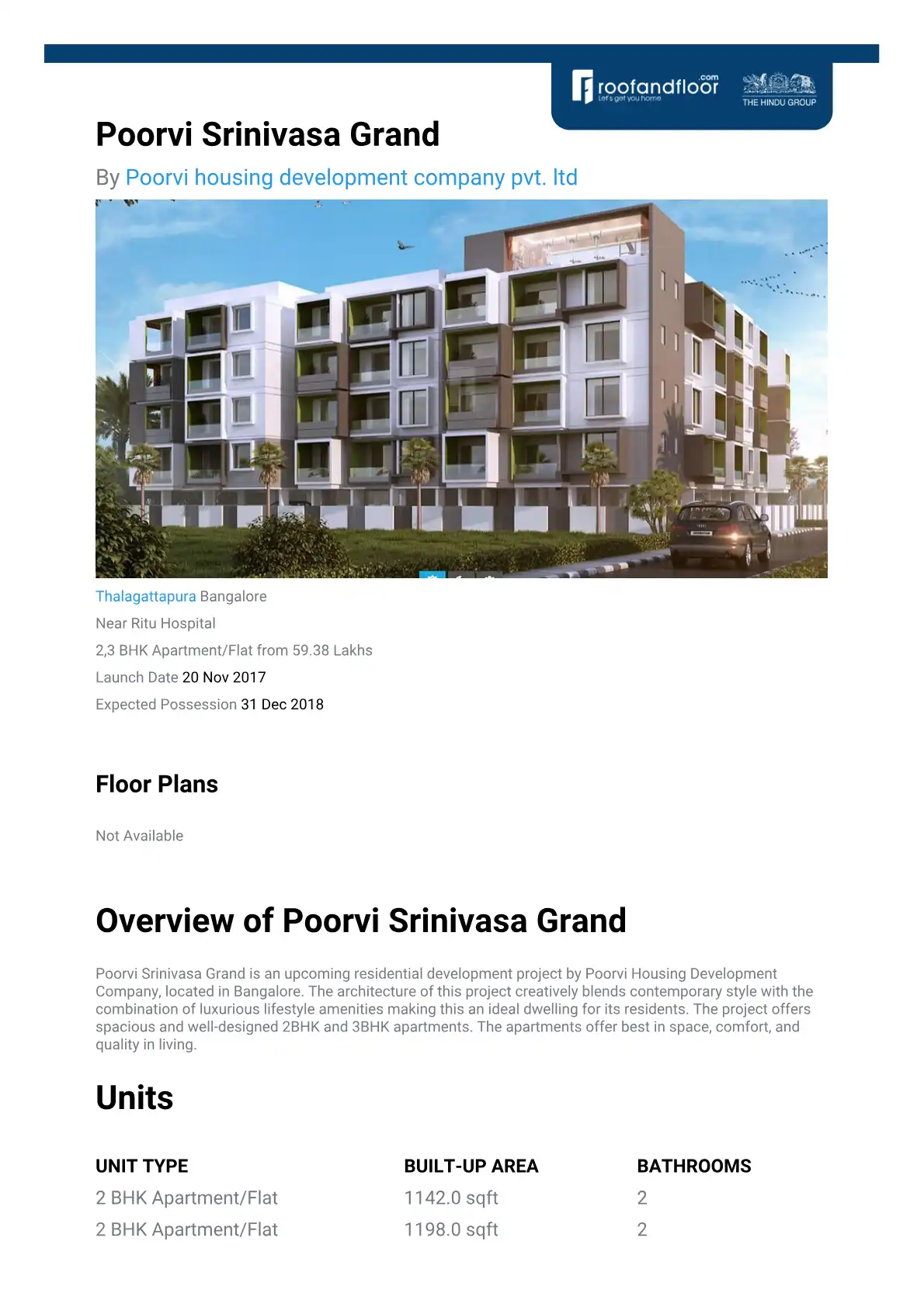 Poorvi Srinivasa Grand is an upcoming residential development project by Poorvi Housing Development Company, located in Bangalore. The architecture of this project creatively blends contemporary style with the combination of luxurious lifestyle ameni...