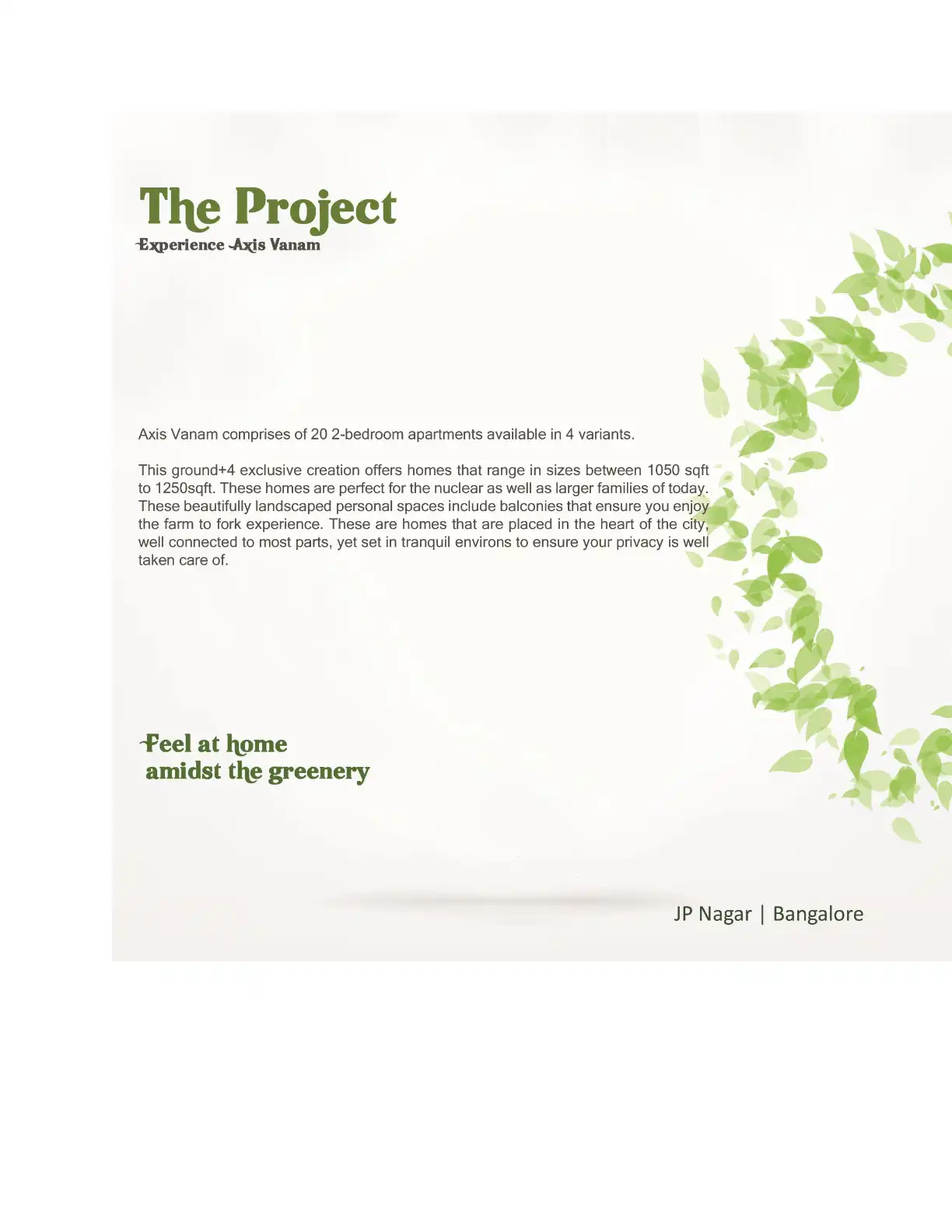 Axis Vanam comprises of 20 2-bedroom apartments available in 4 variants. This ground+4 exclusive creation offers homes that range in sizes between 1050 sqft to 1250sqft.