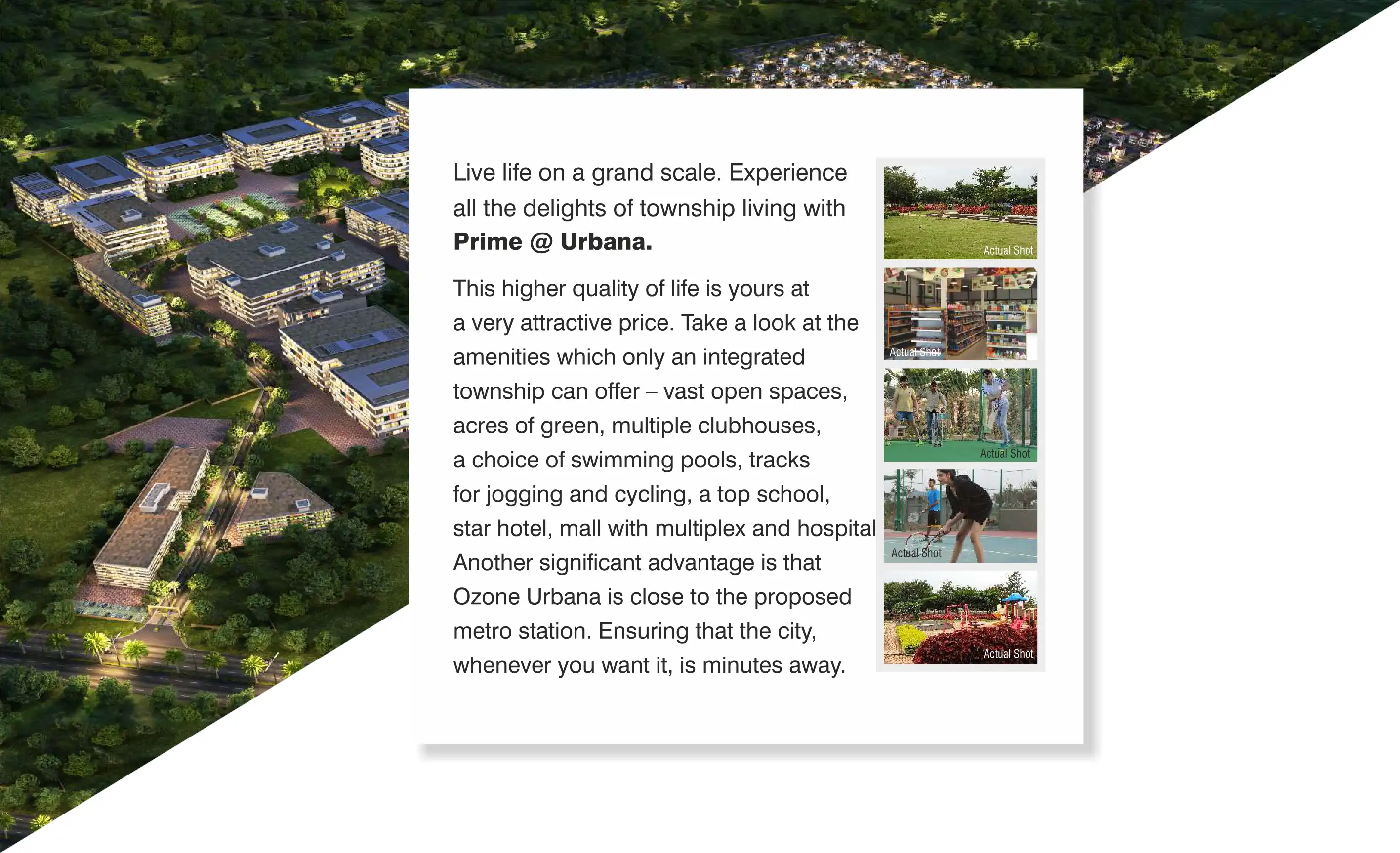 Prime @ Urbana, a township with vast open spaces, acres of green, multiple clubhouses, a choice of swimming pools, tracks for jogging and cycling, a top school, star hotel, mall with multiplex and hospital