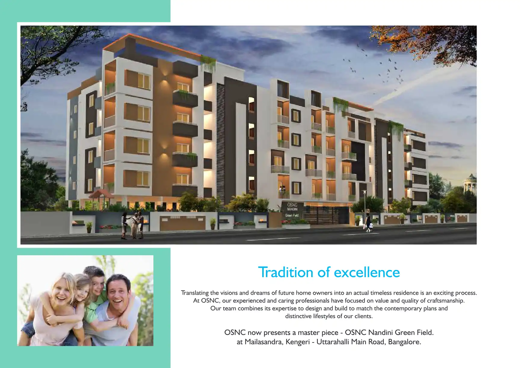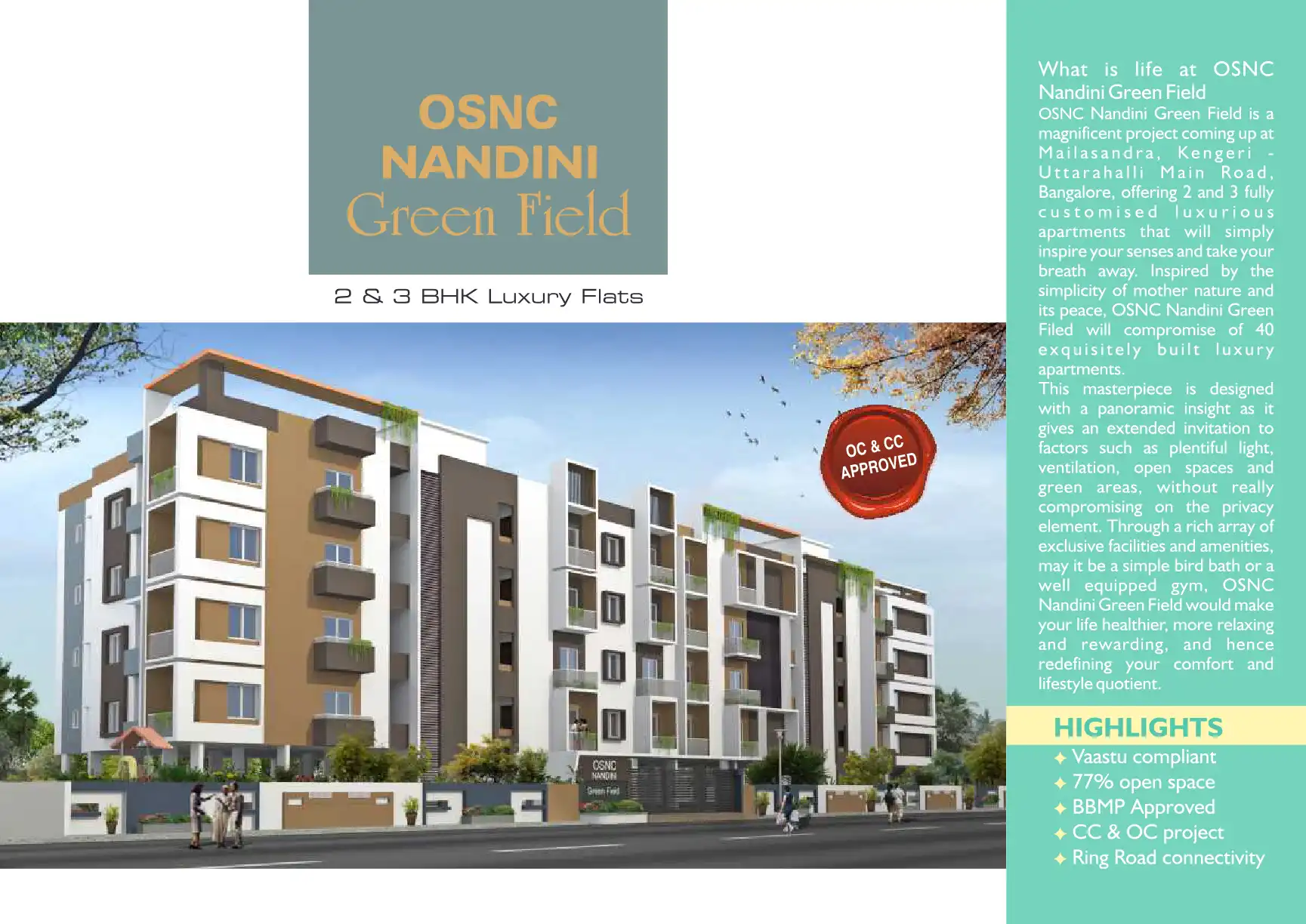 OSNC Nandini Green Field is a magnificent project coming up at Mailasandra, Kengeri Uttarahalli Main Road, Bangalore, offering 2 and 3 fully customised luxurious apartments that will simply inspire your senses and take your breath away.
