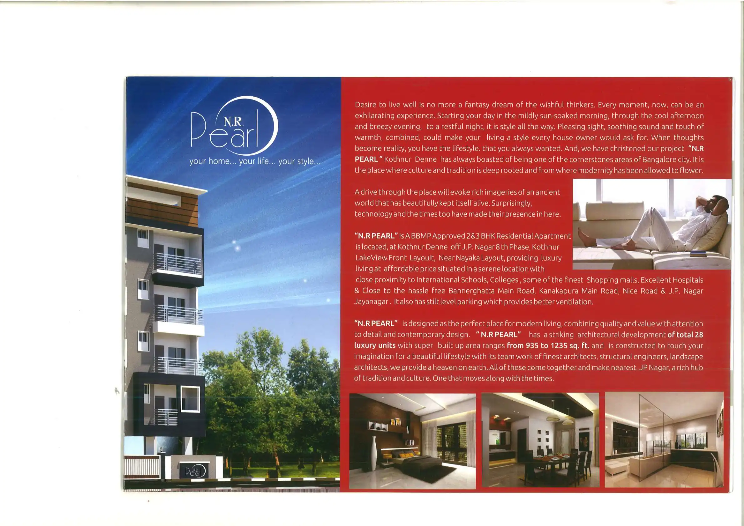 "N.R PEARL" Is A BBMP Approved 2&3 BHK Residential Apartment is located, at Kothnur Denne off J.P. Nagar 8 th Phase, Kothnur LakeView Front Layouit, Near Nayaka Layout, providing luxury living at affordable price situated in a serene location with cl...