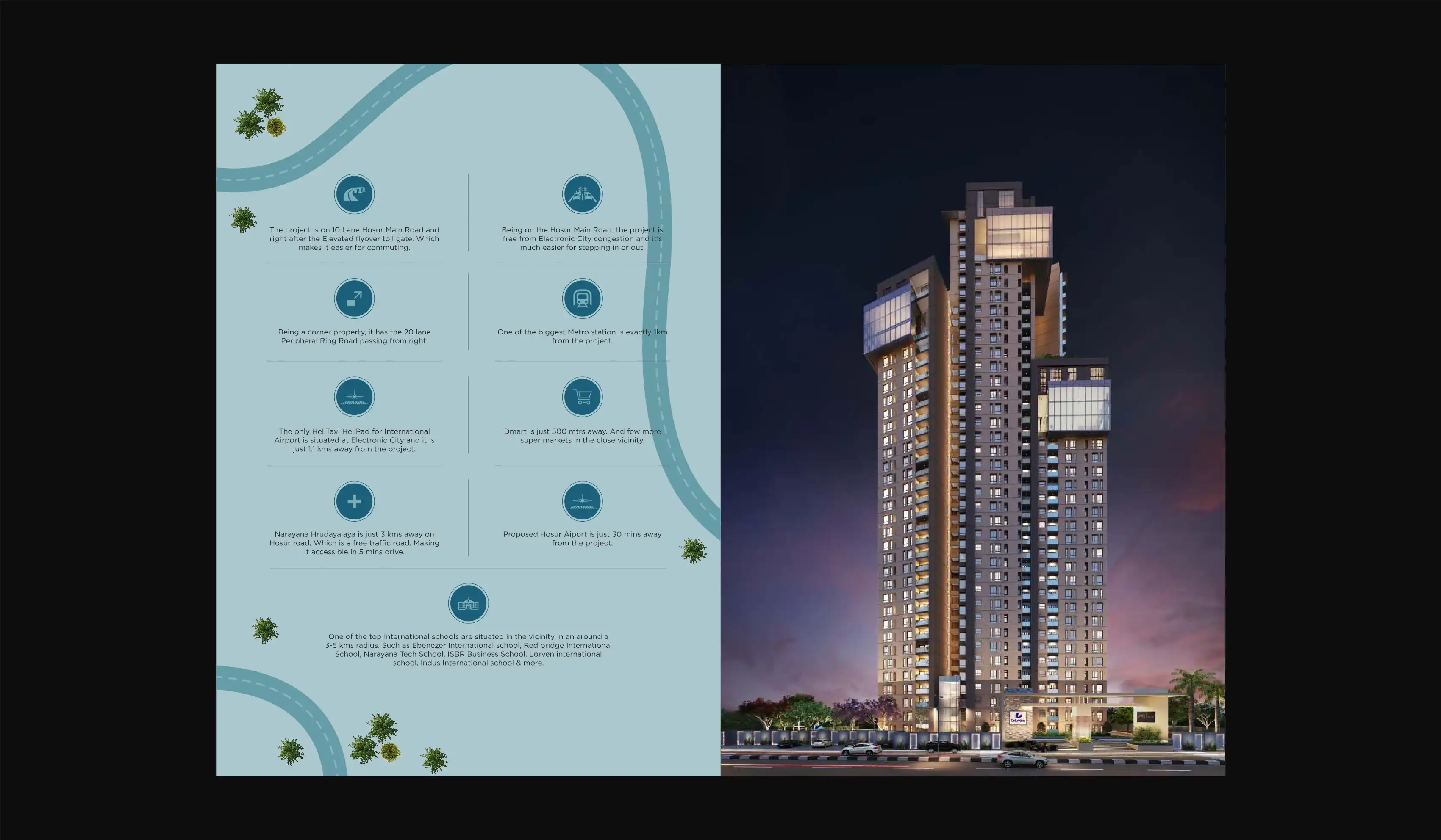 Several new and upcoming residential projects are enhancing the living options around Electronic City Phase II. Mahindra Newhaven by Mahindra Lifespace Developers Ltd. on Hosur Road offers 3 and 4 BHK apartments, while Ajmera Iris by Ajmera Realty in Electronic City features 2 and 3 BHK residential deck homes, both promising modern amenities and lifestyle.