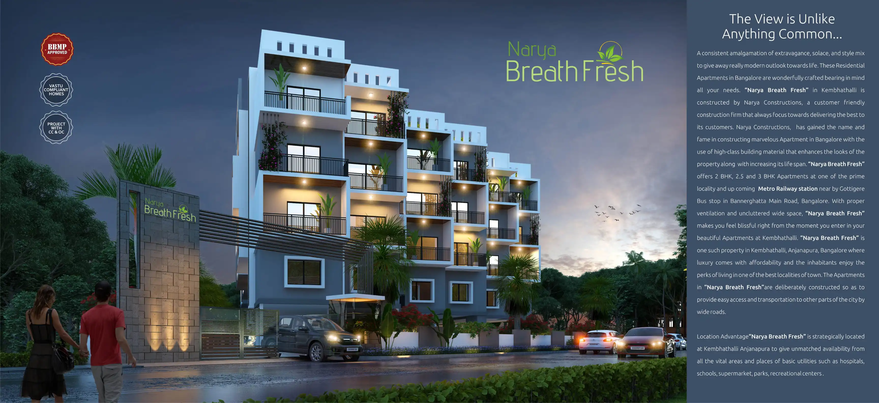 Narya Breath Fresh offers 2 BHK, 2.5 and 3 BHK Apartments at one of the prime locality and up coming Metro Railway station near by Gottigere Bus stop in Bannerghatta Main Road, Bangalore.