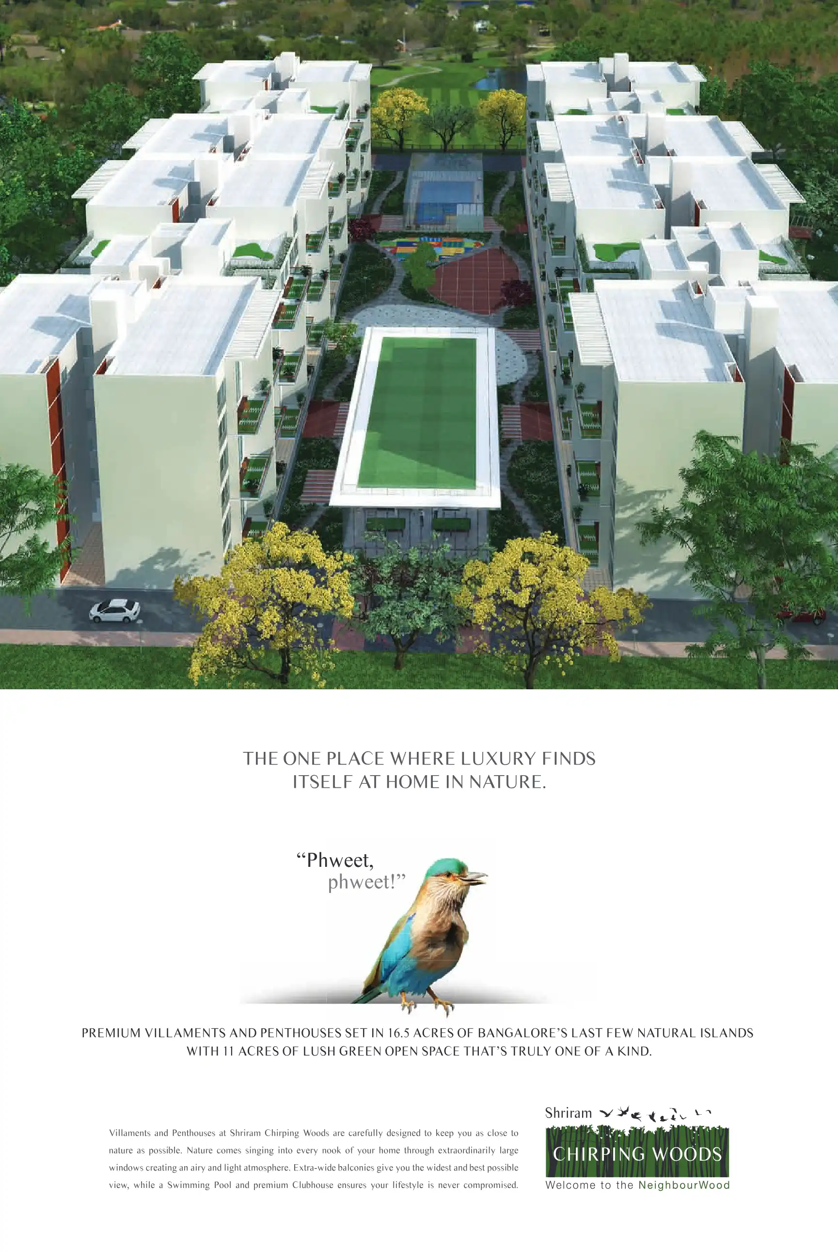 Villaments and Penthouses at Shriram Chirping Woods are carefully designed to keep you as close to nature as possible. Nature comes singing into every nook of your home through extraordinarily large windows creating an airy and light atmosphere. Extr...