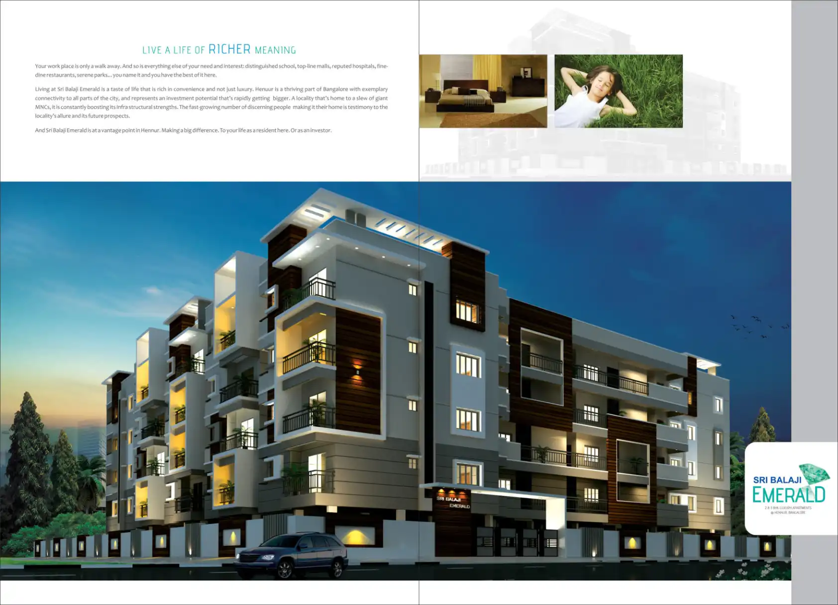 Sri Balaji Emerald is a luxury apartment project located in Hennur, Bangalore. It offers 2 and 3 BHK apartments with various amenities.