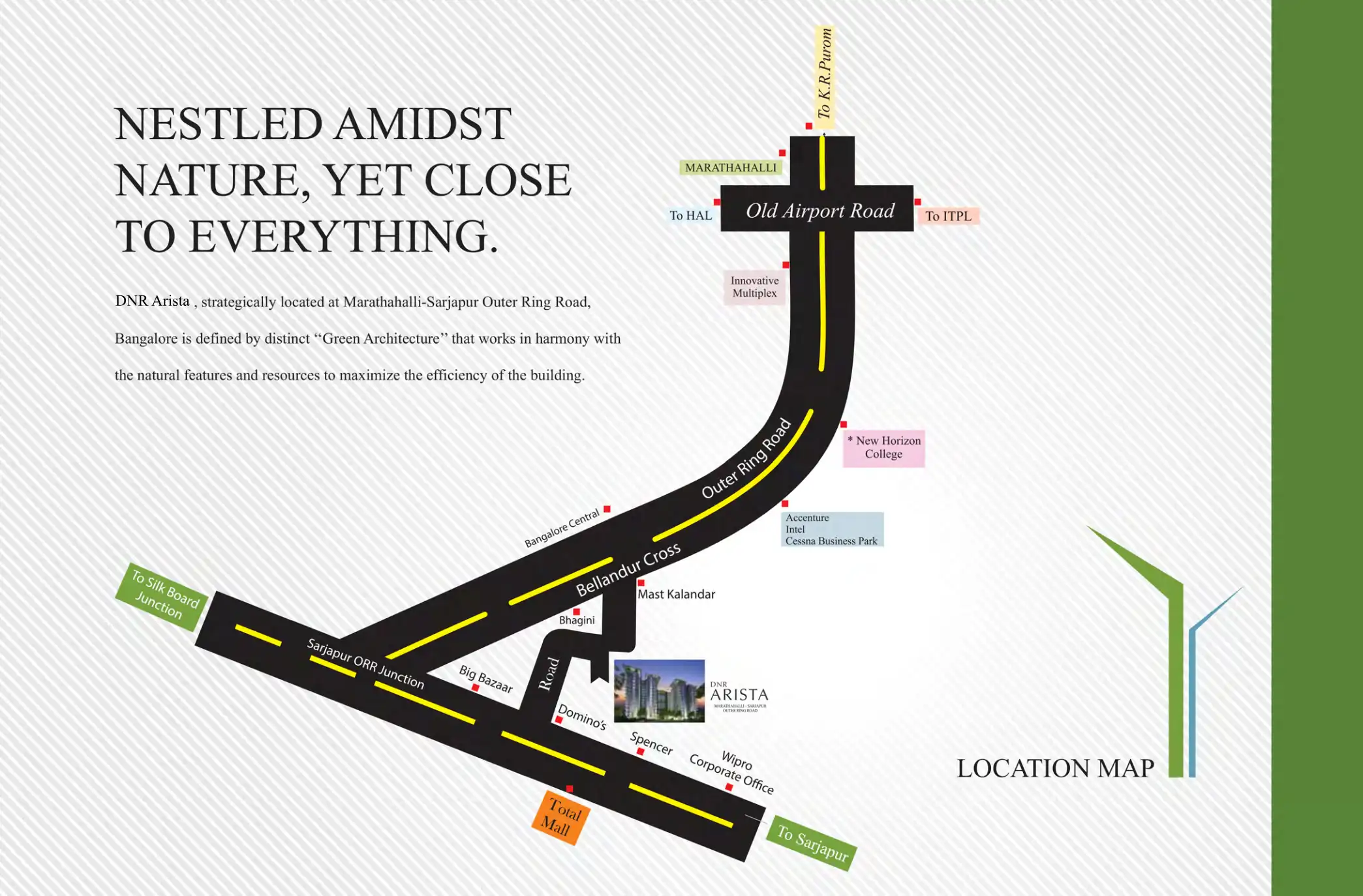 DNR Arista, strategically located at Marathahalli-Sarjapur Outer Ring Road, Bangalore is defined by distinct “Green Architecture” that works in harmony with the natural features and resources to maximize the efficiency of the building.