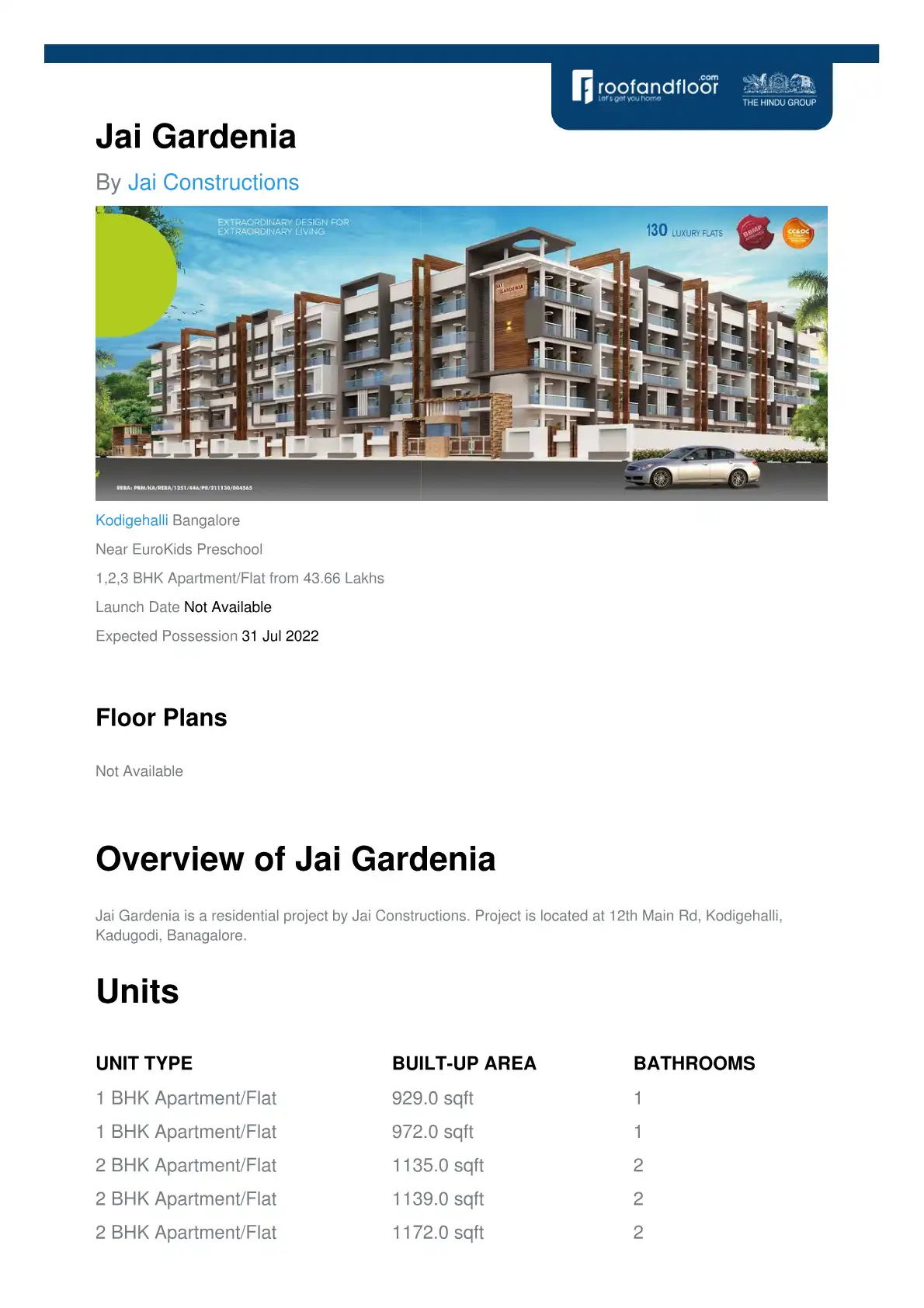 Jai Gardenia is a residential project by Jai Constructions. Project is located at 12th Main Rd, Kodigehalli, Kadugodi, Banagalore.