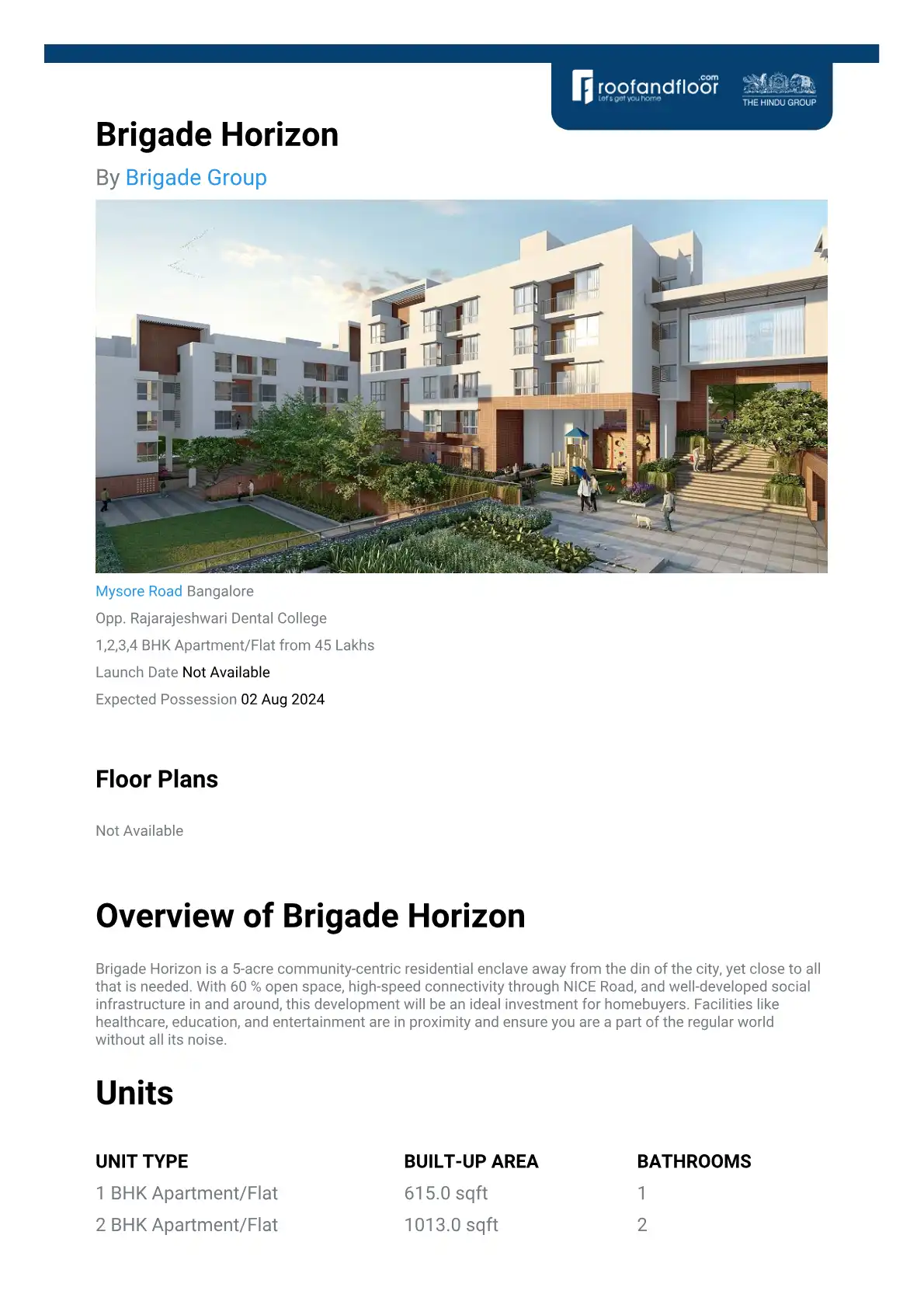 Brigade Horizon is a 5-acre community-centric residential enclave away from the din of the city, yet close to all that is needed. With 60 % open space, high-speed connectivity through NICE Road, and well-developed social infrastructure in and around,...