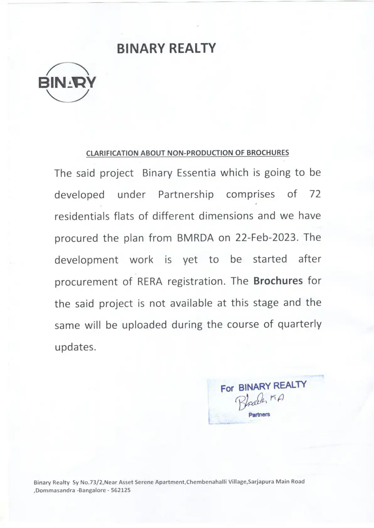 The said project Binary Essentia which is going to be developed under Partnership comprises of 72 residentials flats of different dimensions and we have procured the plan from BMRDA on 22-Feb-2023. The development work is yet to be started after proc...