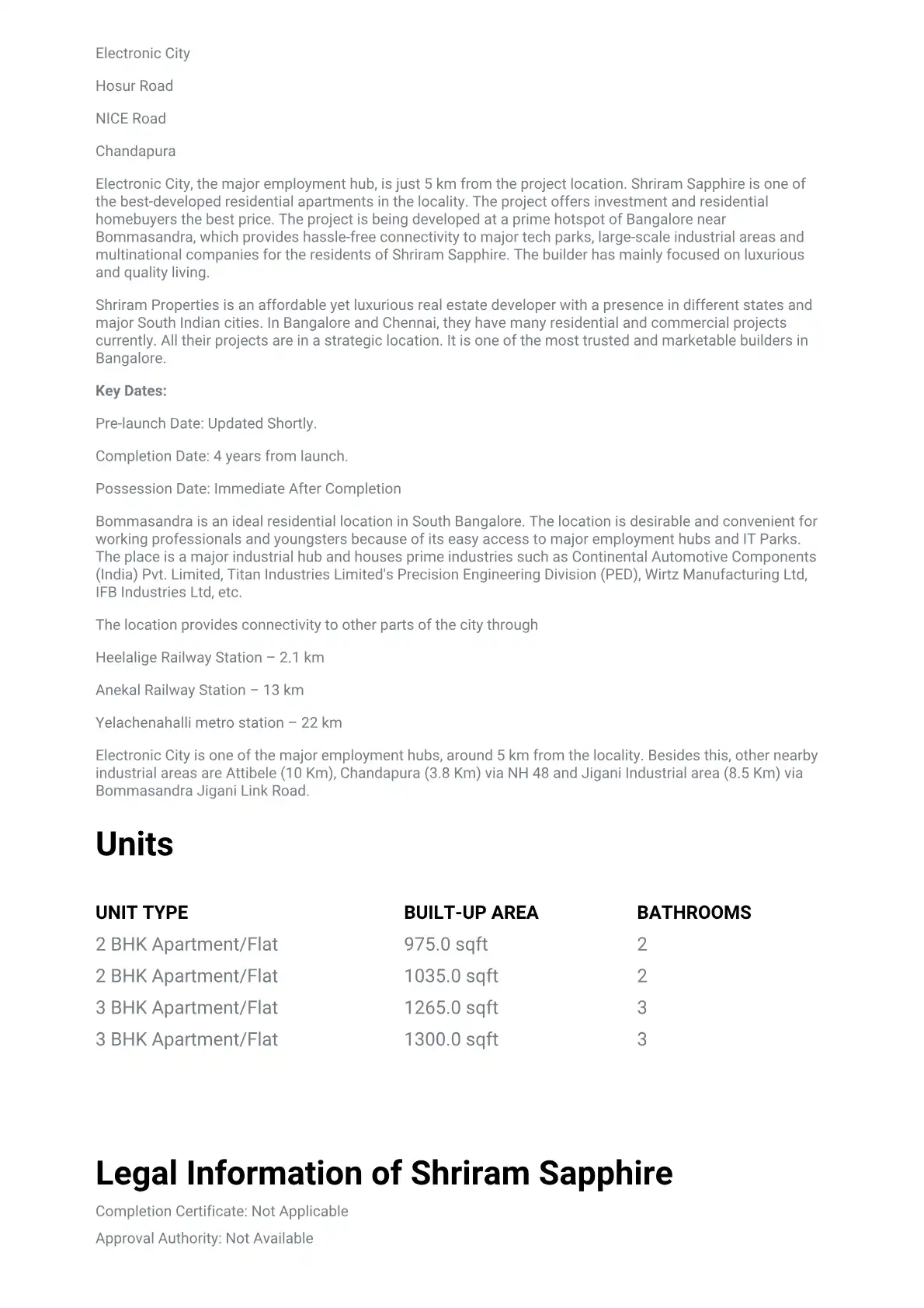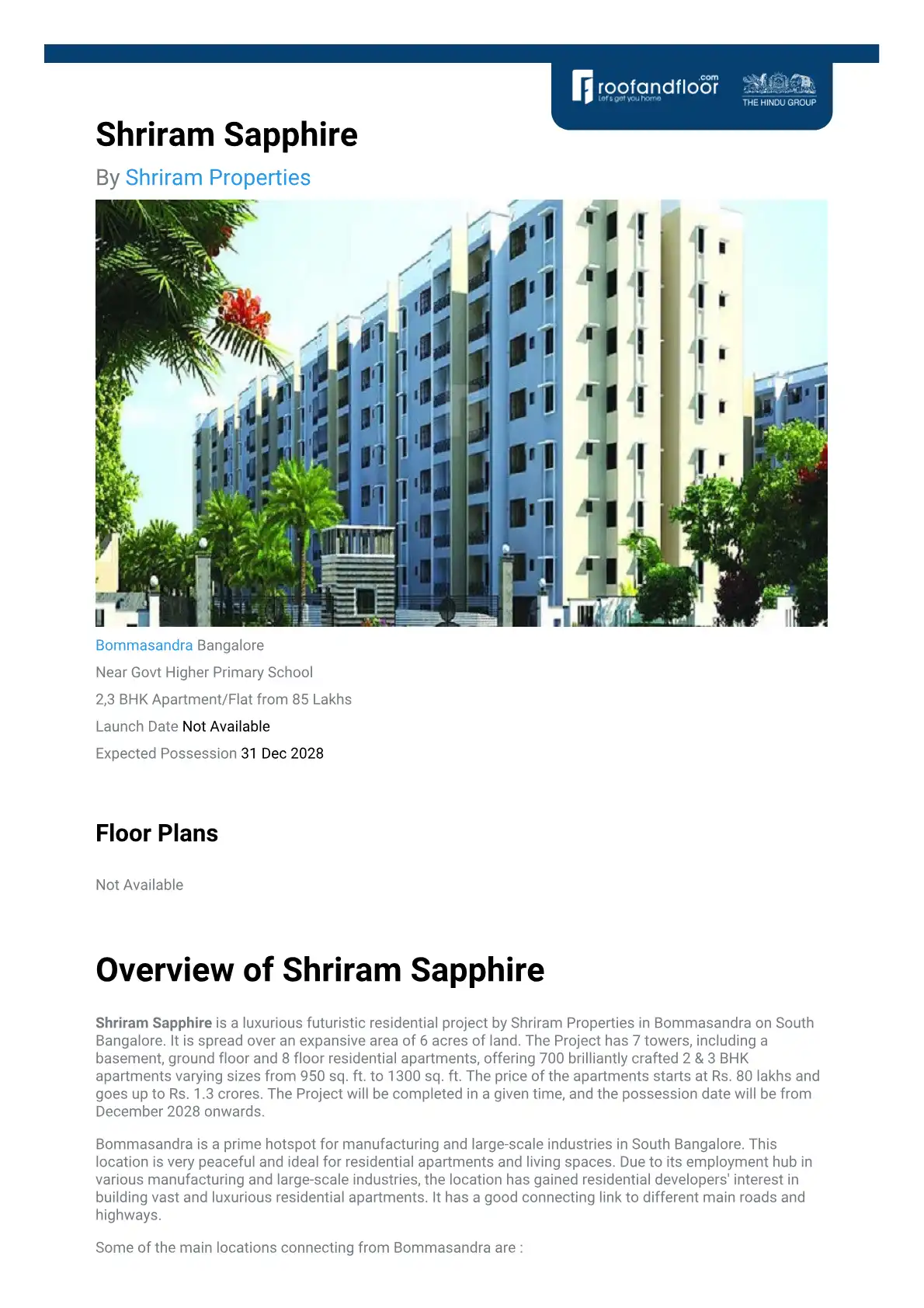 Shriram Sapphire, Bommasandra, Bangalore | PropHunt | PropHunt