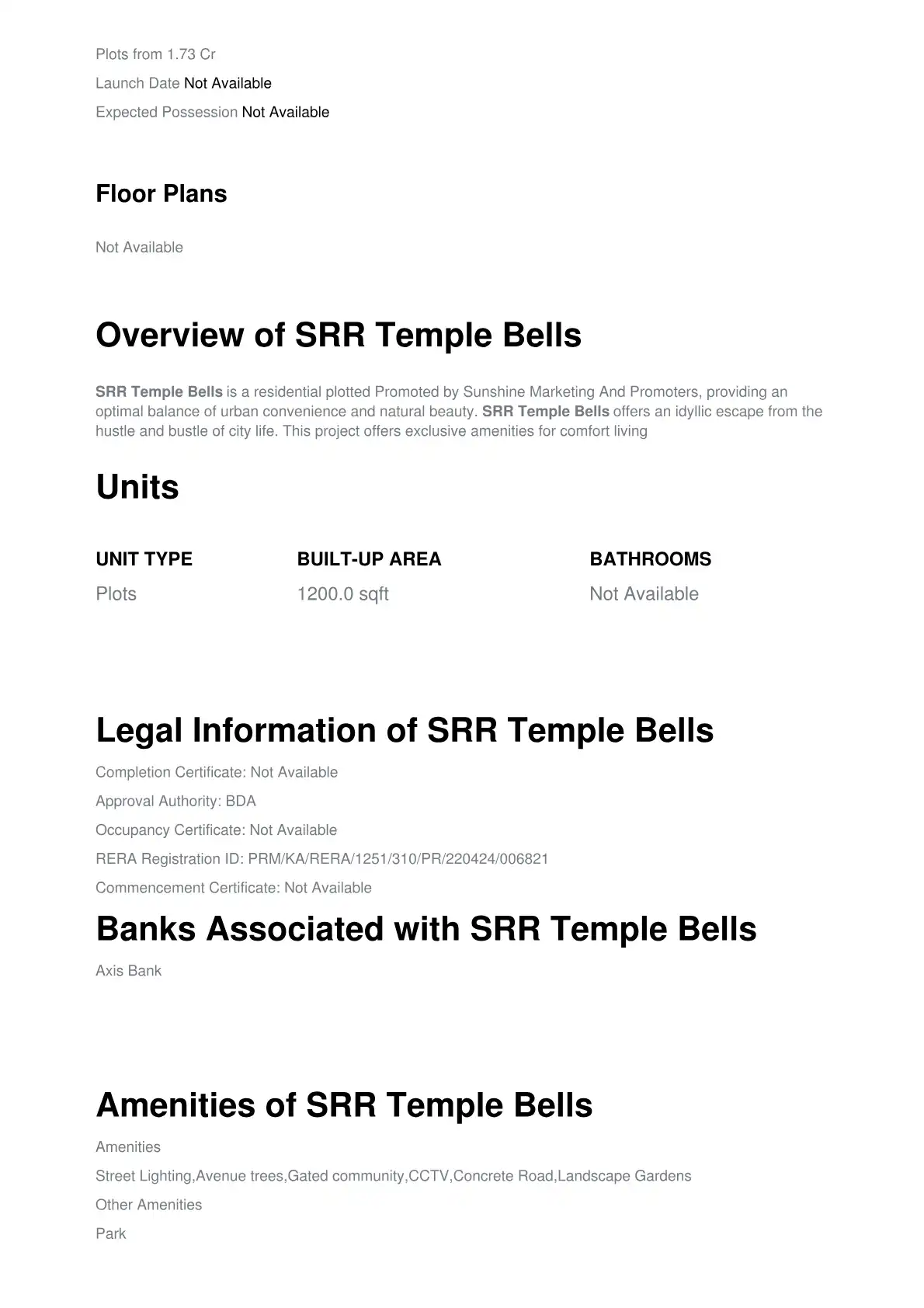SRR Temple Bells is a residential plotted Promoted by Sunshine Marketing And Promoters, providing an optimal balance of urban convenience and natural beauty. SRR Temple Bells offers an idyllic escape from the hustle and bustle of city life. This proj...