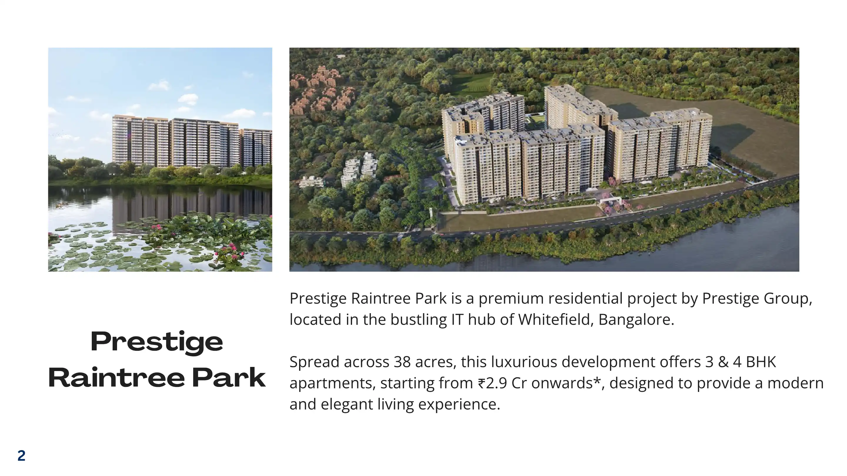 Prestige Raintree Park is a premium residential project by Prestige Group, located in the bustling IT hub of Whitefield, Bangalore. Spread across 38 acres, this luxurious development offers 3 & 4 BHK apartments, starting from 2.9 Cr onwards*, designe...