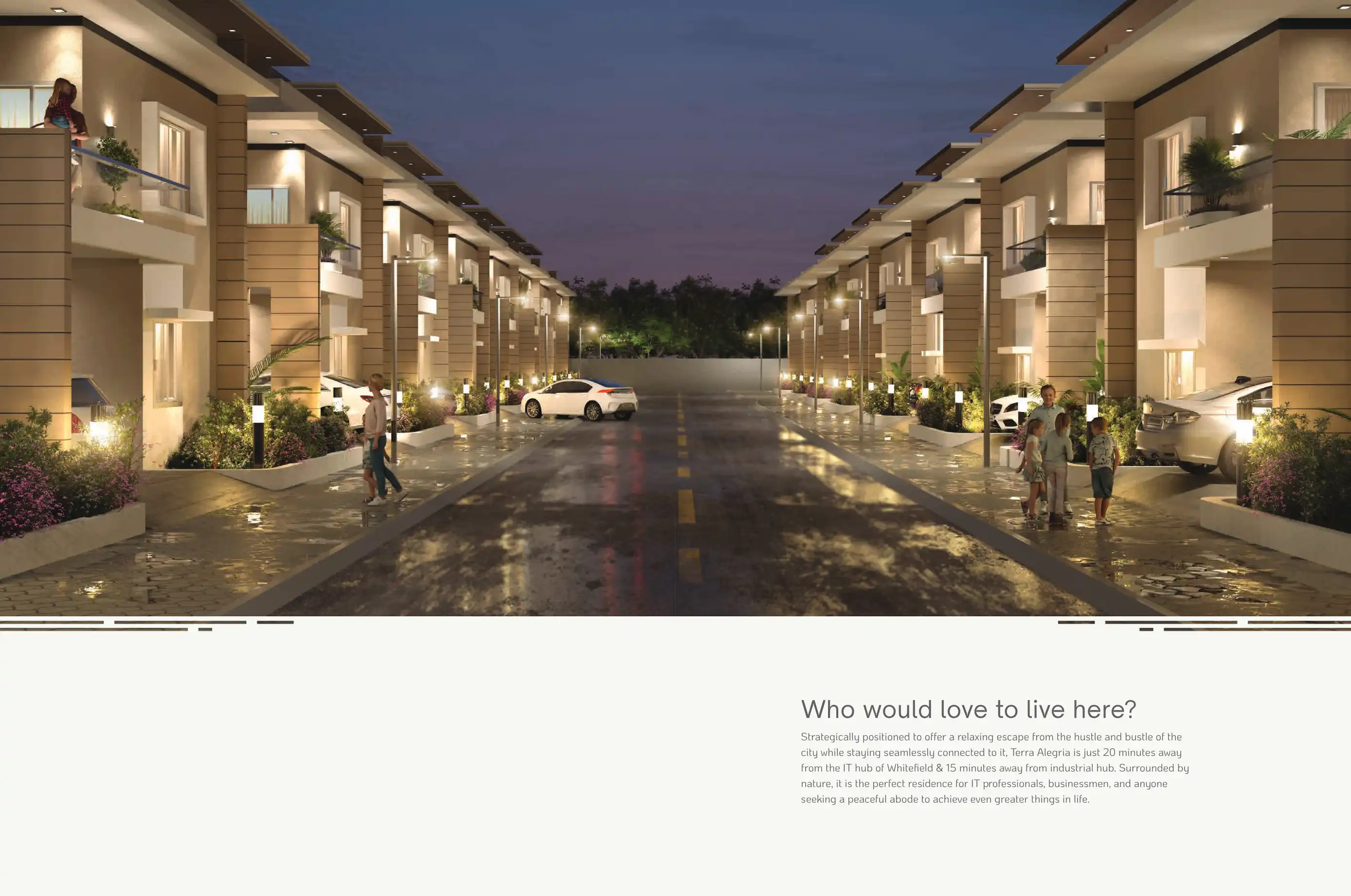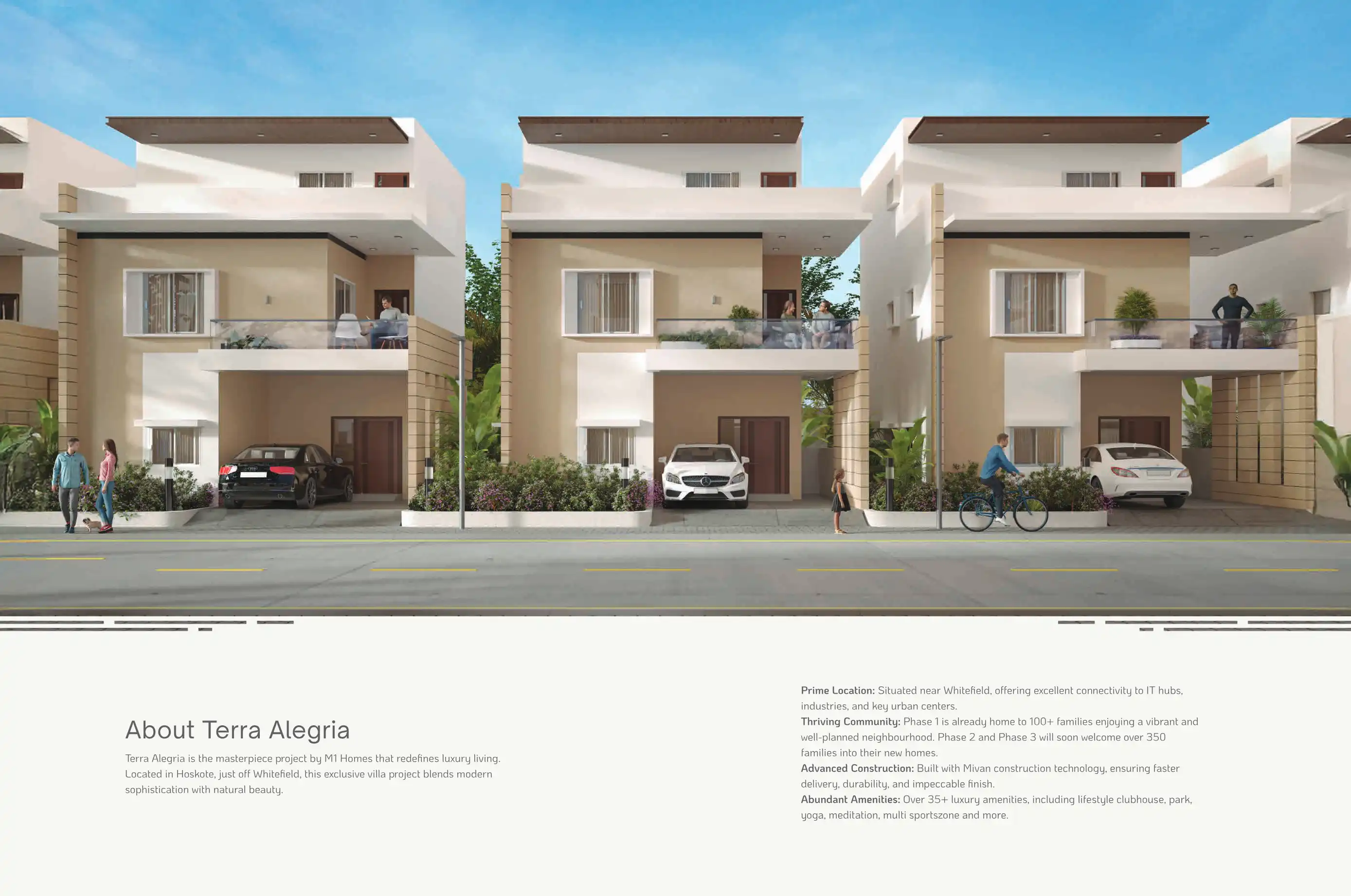 Terra Alegria is the masterpiece project by M1 Homes that redefines luxury living. Located in Hoskote, just off Whitefield, this exclusive villa project blends modern sophistication with natural beauty.