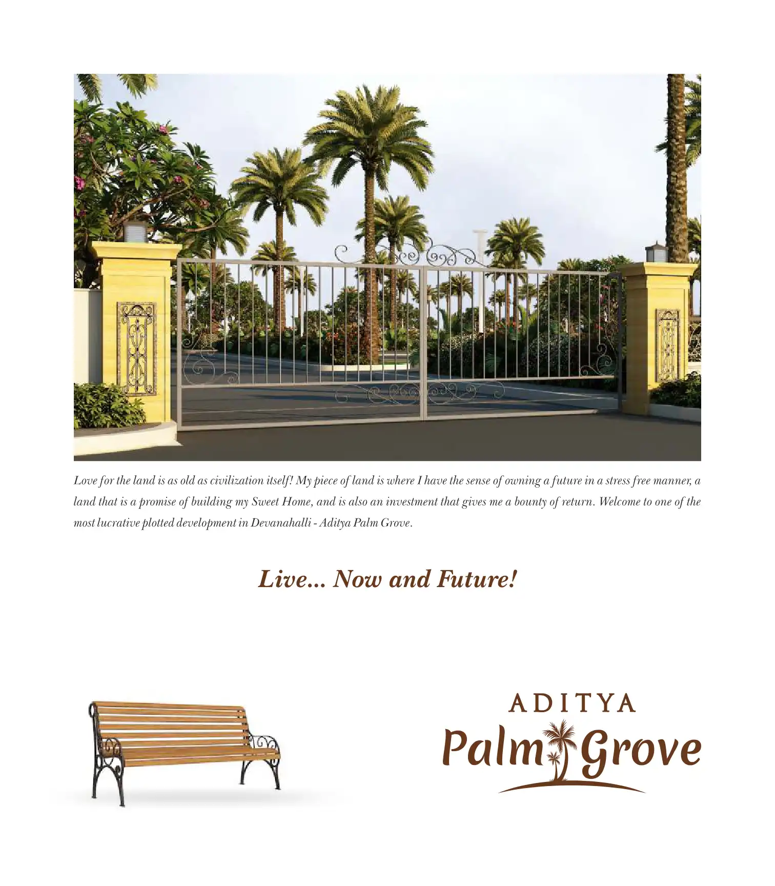 Aditya Palm Grove. The Open Plots Project of 4.7 acres is located at the heart center of several exclusive residential plotting projects at Devanahalli. It's the perfect place to build your independent house and enjoy the villa life.