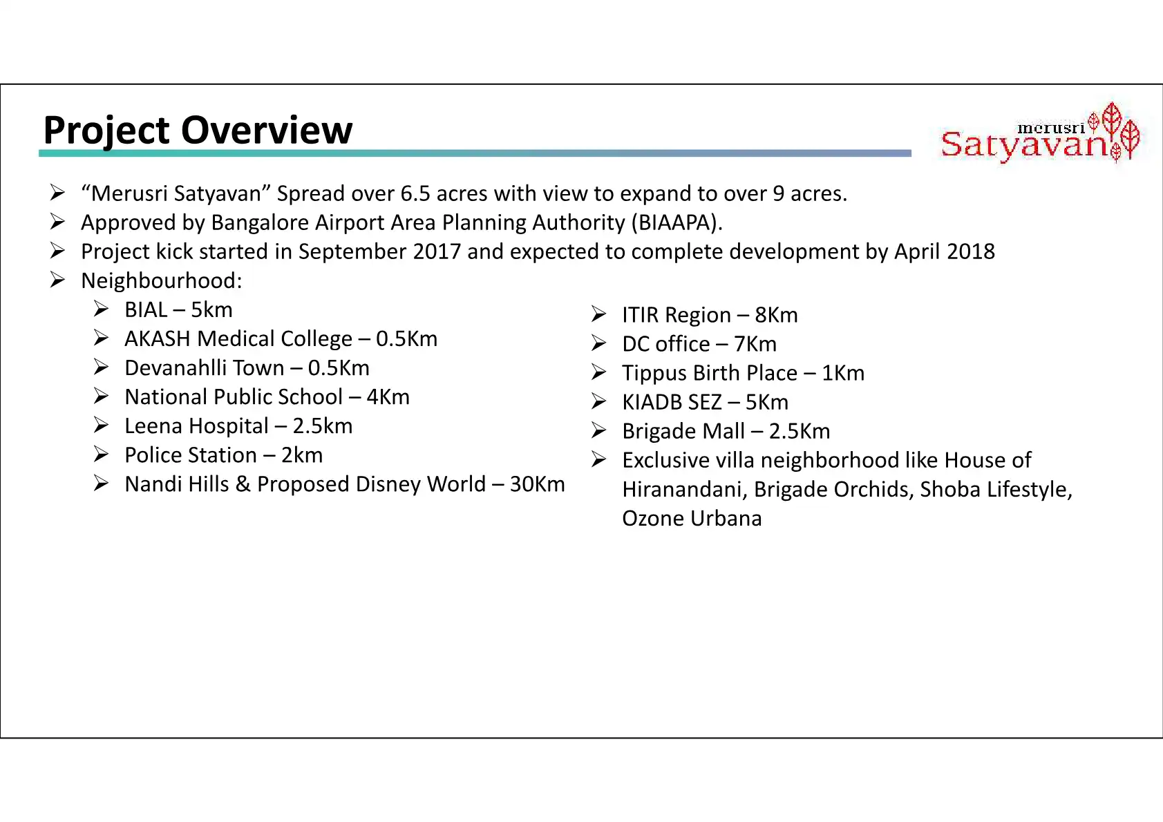 "Merusri Satyavan” Spread over 6.5 acres with view to expand to over 9 acres. Approved by Bangalore Airport Area Planning Authority (BIAAPA). Project kick started in September 2017 and expected to complete development by April 2018