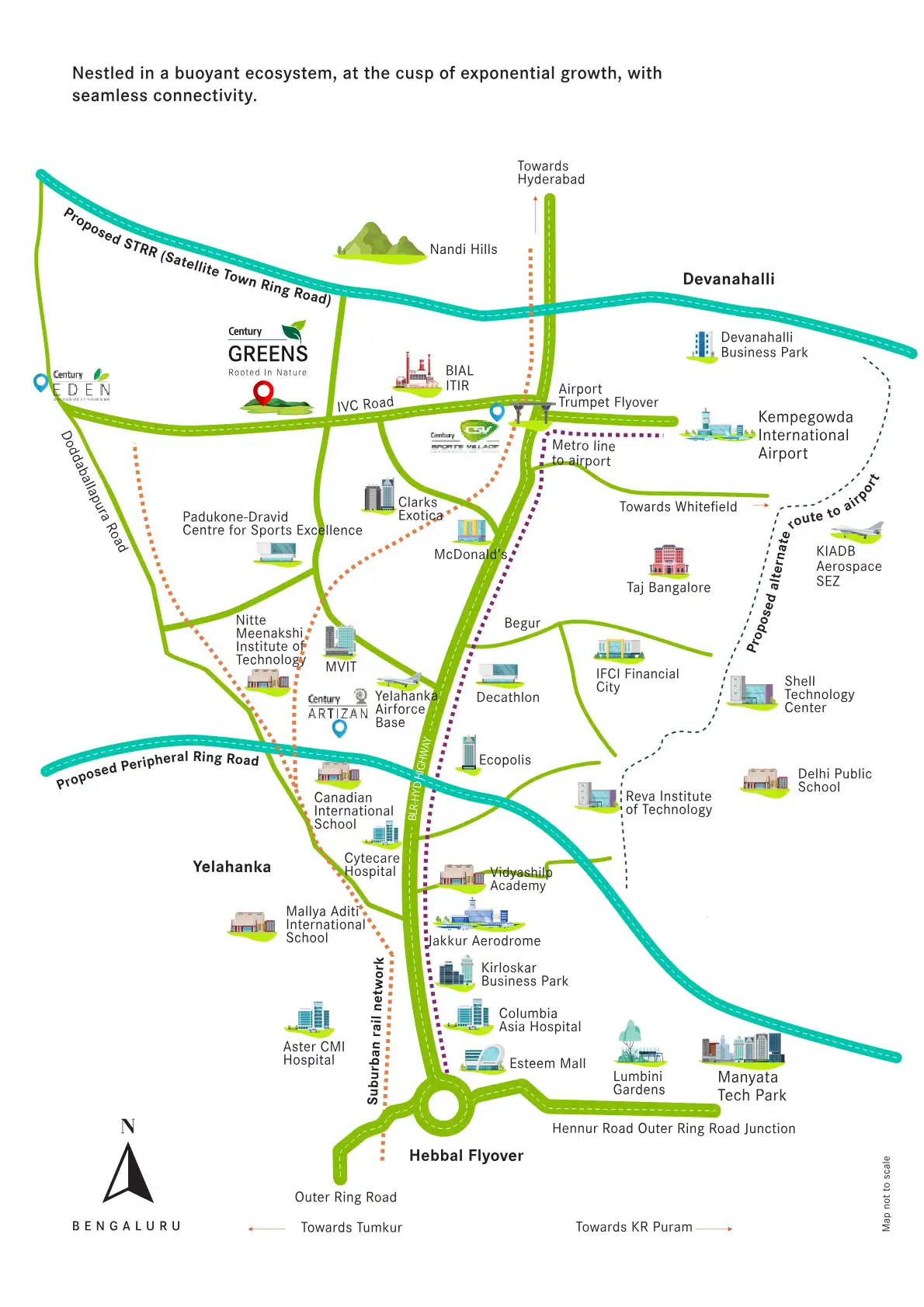 A 23-acre plotted development nestled in a lush green belt and in one of the most emergent micro-markets of North Bengaluru. Located off IVC Road, Devanahalli 20 minutes from Kempegowda International Airport.