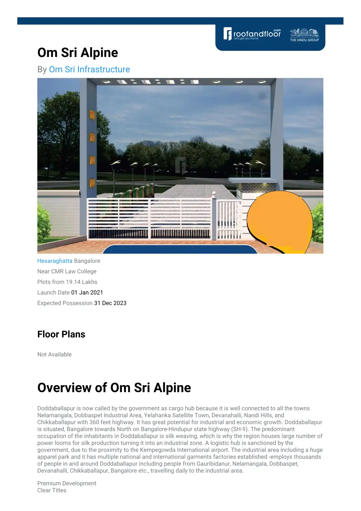Shriram Pristine Estates is a notable plotted development project by SPL Housing located on the Doddaballapura Highway. It offers well-planned residential plots designed for modern living, providing a secure and amenity-rich community. The project is strategically positioned for excellent connectivity and convenience.
