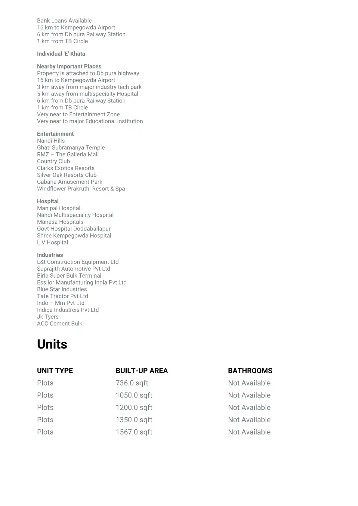 Doddaballapur provides a range of essential amenities for its residents, including reputable educational institutions like Sri Devaraj Urs International Residential School and R.L. Jalappa Institute of Technology, healthcare facilities, local markets, and banking services. The area's developing infrastructure supports a comfortable and convenient lifestyle.