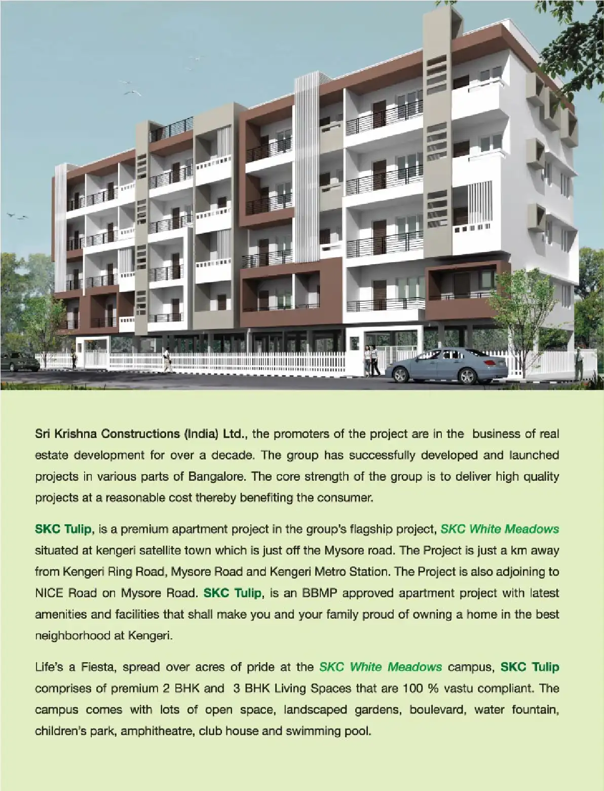 SKC Tulip, is a premium apartment project in the group's flagship project, SKC White Meadows situated at kengeri satellite town which is just off the Mysore road. The Project is just a km away from Kengeri Ring Road, Mysore Road and Kengeri Metro Sta...