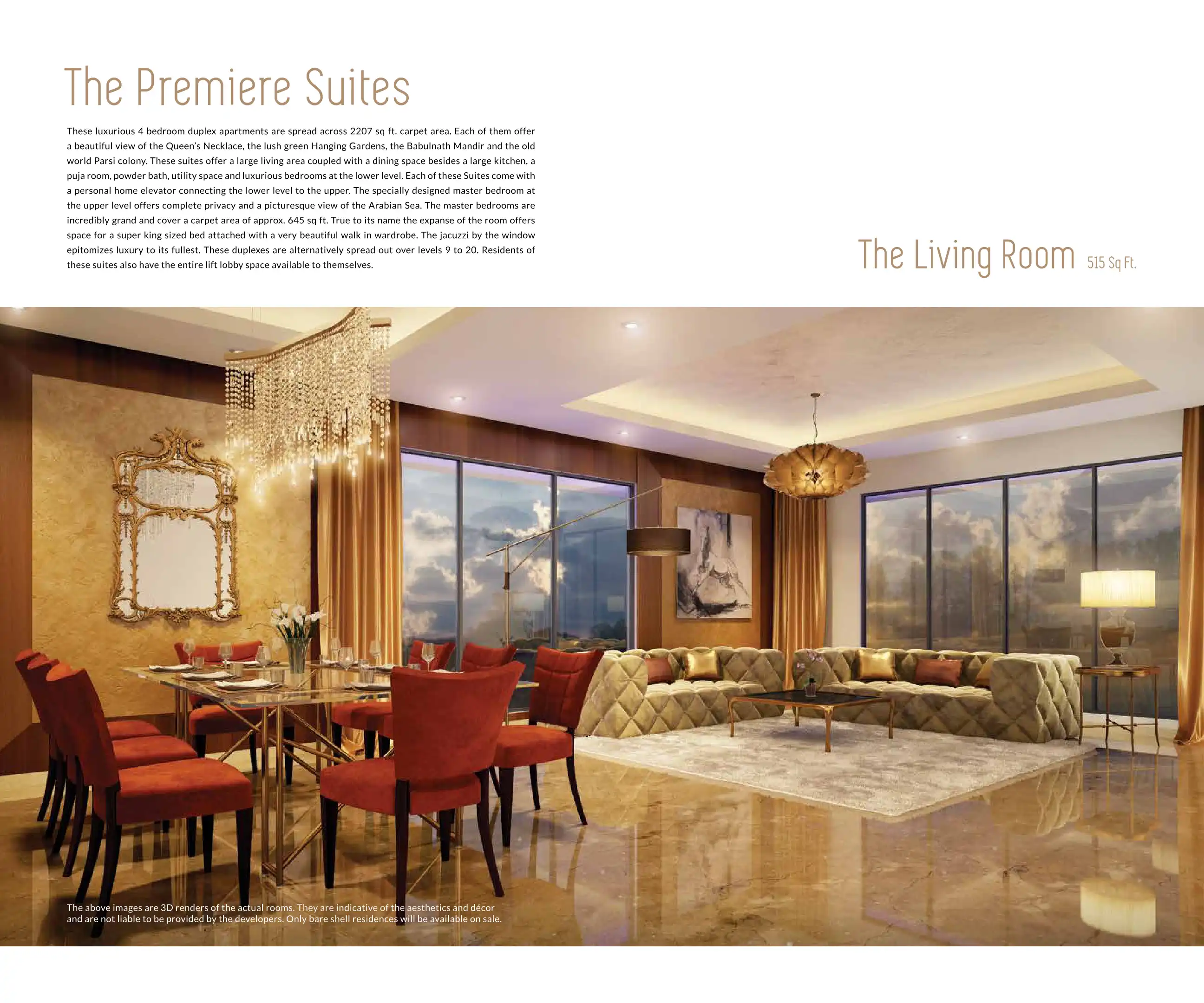 The Premiere Suites are luxurious 4 bedroom duplex apartments spread across 2207 sq ft. carpet area, offering a beautiful view of the Queen's Necklace, Hanging Gardens, Babulnath Mandir and the old world Parsi colony. Each Suite comes with a personal...