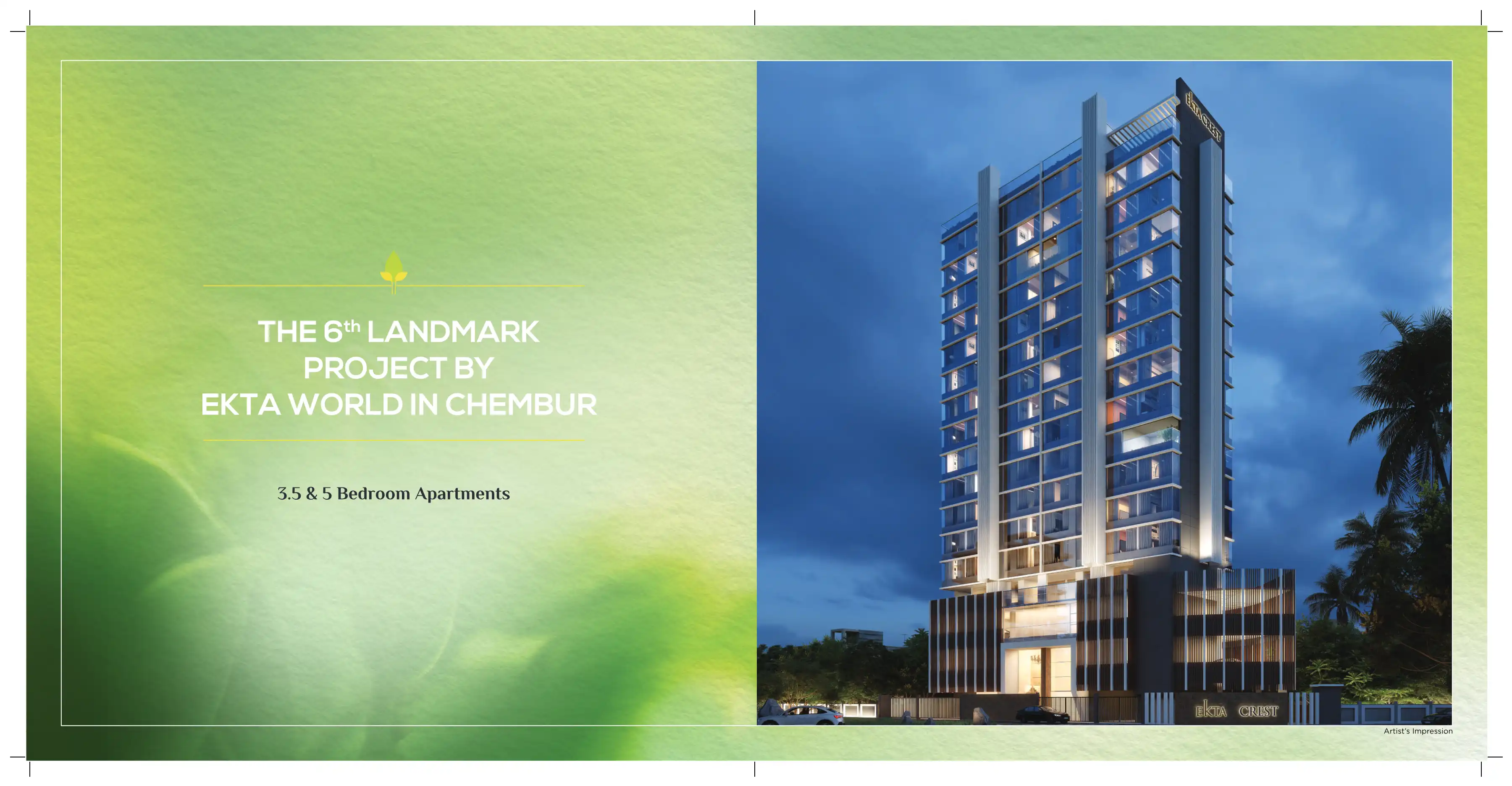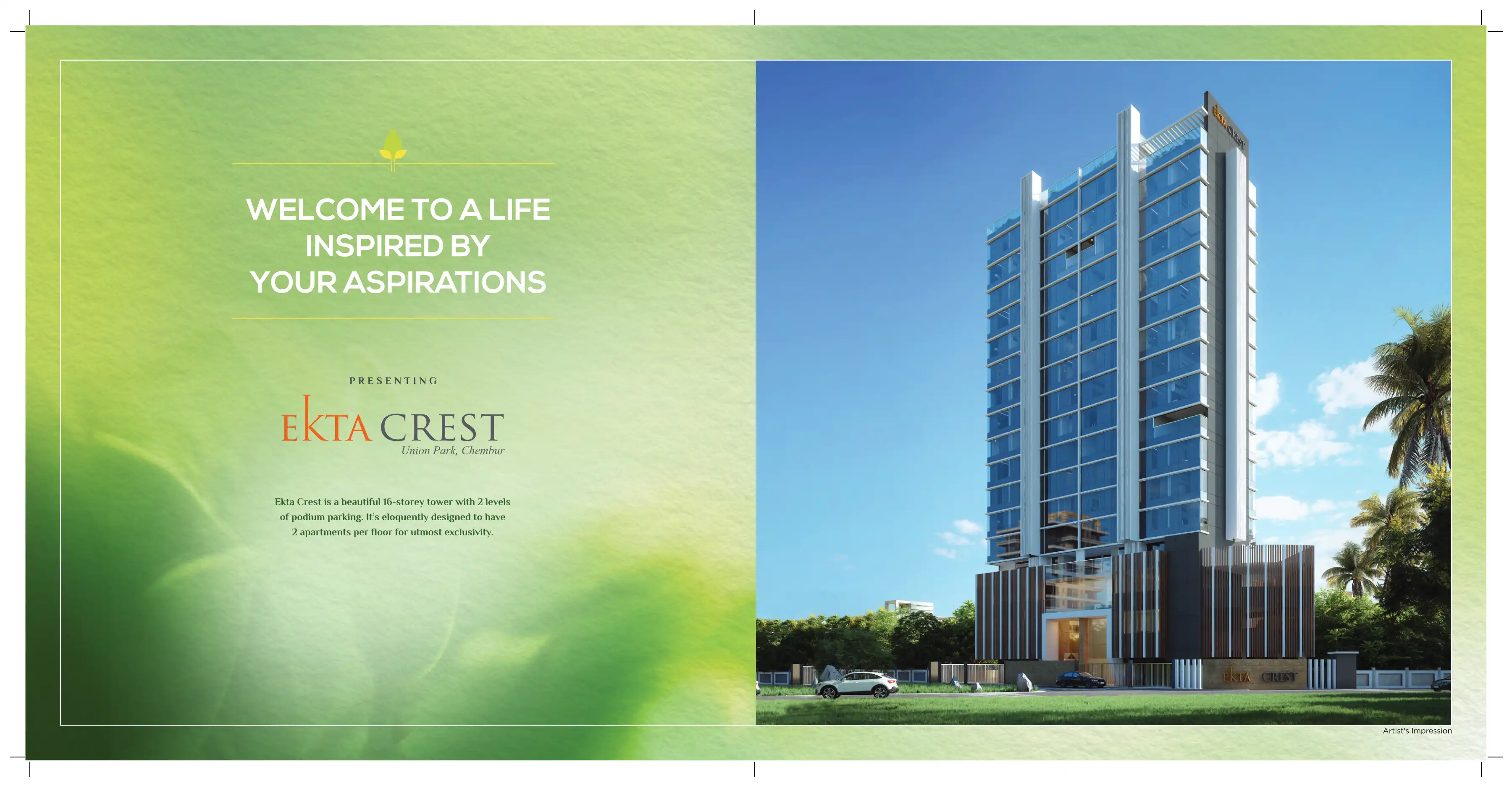 Ekta Crest is a beautiful 16-storey tower with 2 levels of podium parking. It's eloquently designed to have 2 apartments per floor for utmost exclusivity.