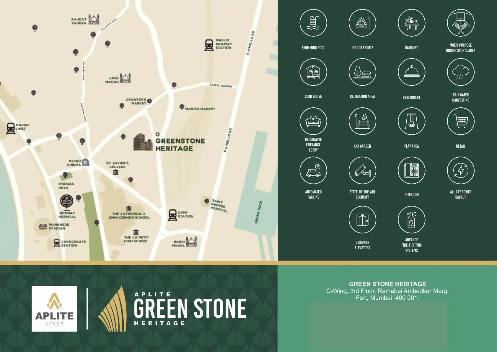 Greenstone Heritage is located in Mumbai's Crawford Market area. Presenting six towers, the architecture mixes utility with heritage, bringing you a classical home with a modern heart.